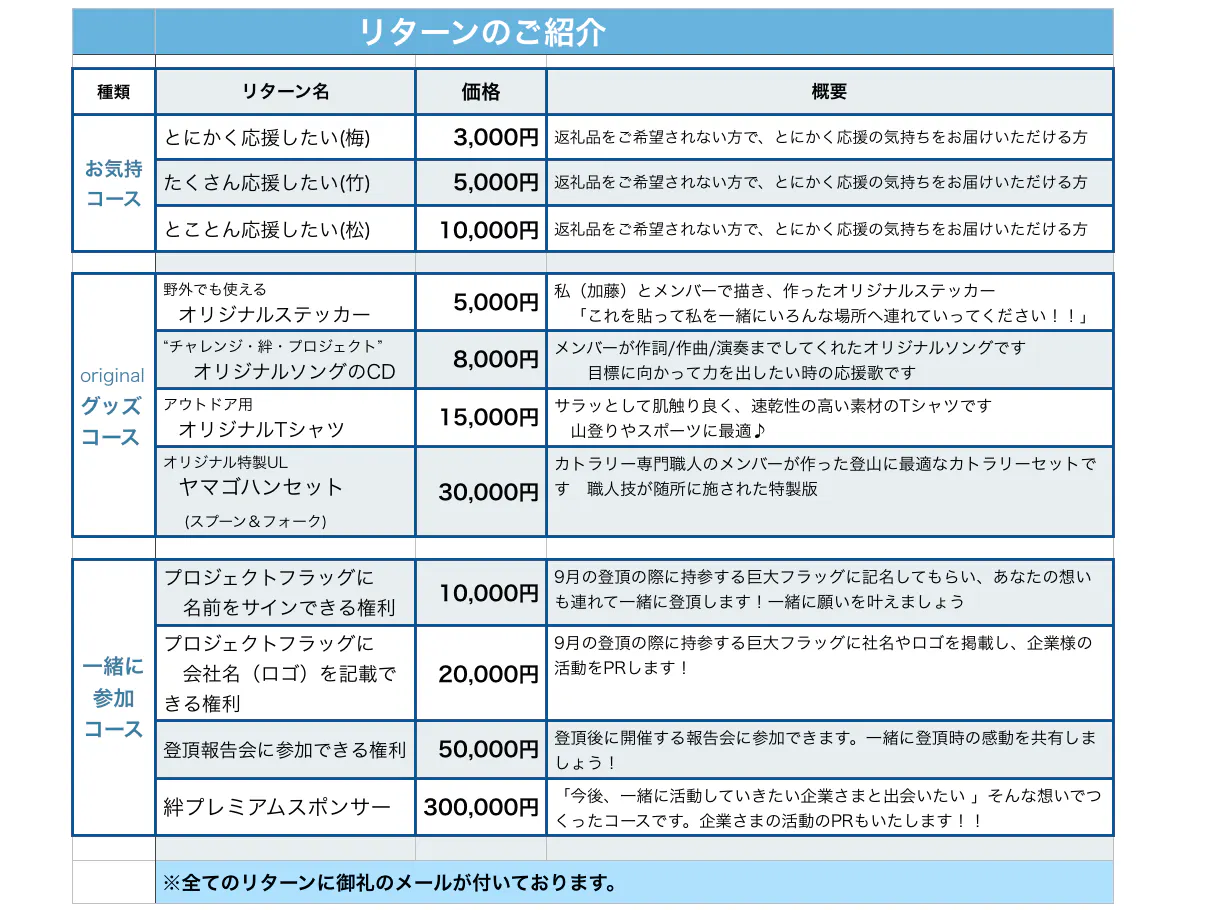 * 万が一、9月に悪天候が連続したり、それ以外の不測の自体により、登頂が叶わなかった場合も、ご支援いただいた支援金は返金いたしませんので、ご理解のほど、何卒よろしくお願いいたします。登頂が叶わなかった場合も、今後の“山岳ユニバーサルツーリズム”活動の推進に最大限役立つよう、尽力いたします。