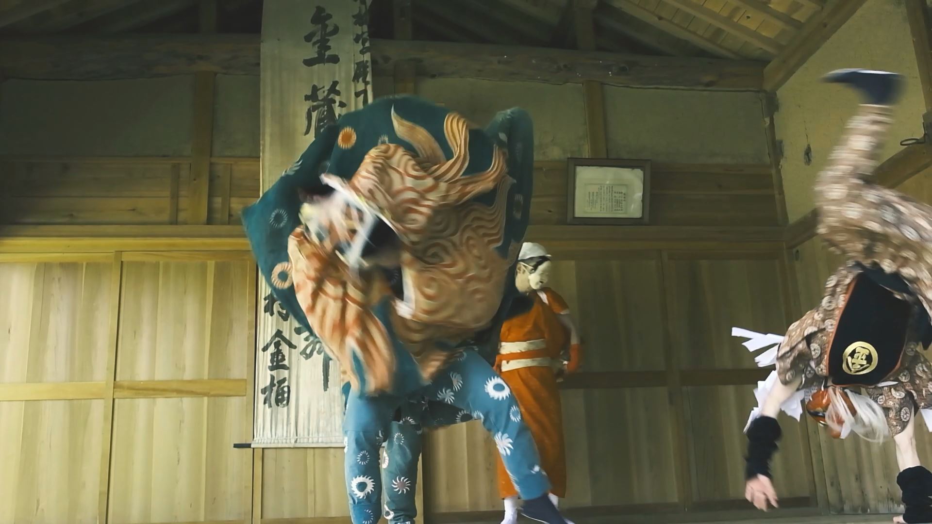 金蔵獅子は飛騨発祥とされ飛騨から越中にかけて伝承されていますが、地区によって動きが異なり金桶の金蔵獅子は他の地区より激しく速い動きが特徴です。特にこの金桶の金蔵獅子は岐阜県指定重要無形民俗文化財のひとつとなっています。