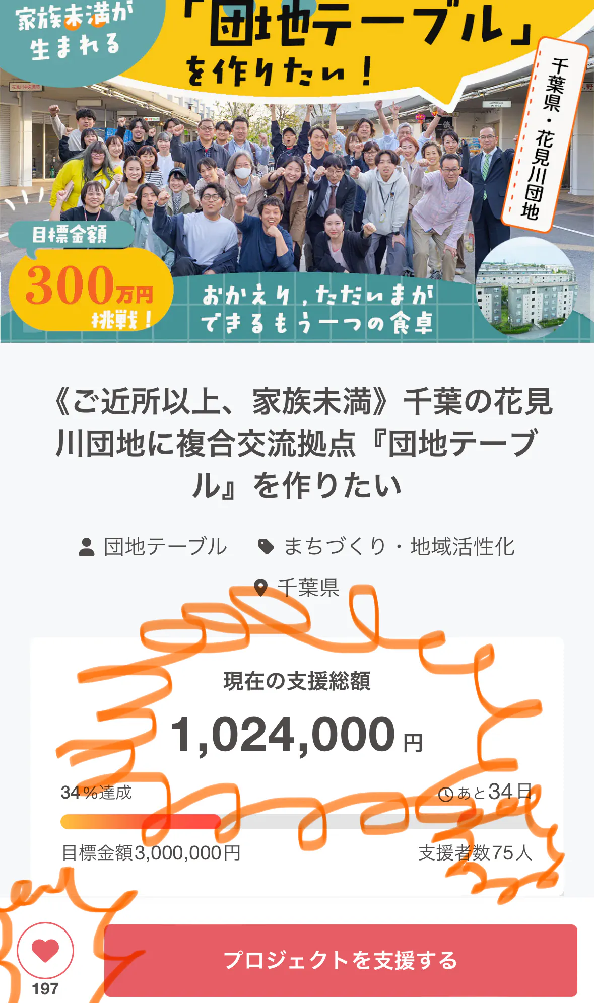 支援者数は75人、お気に入り数は197。