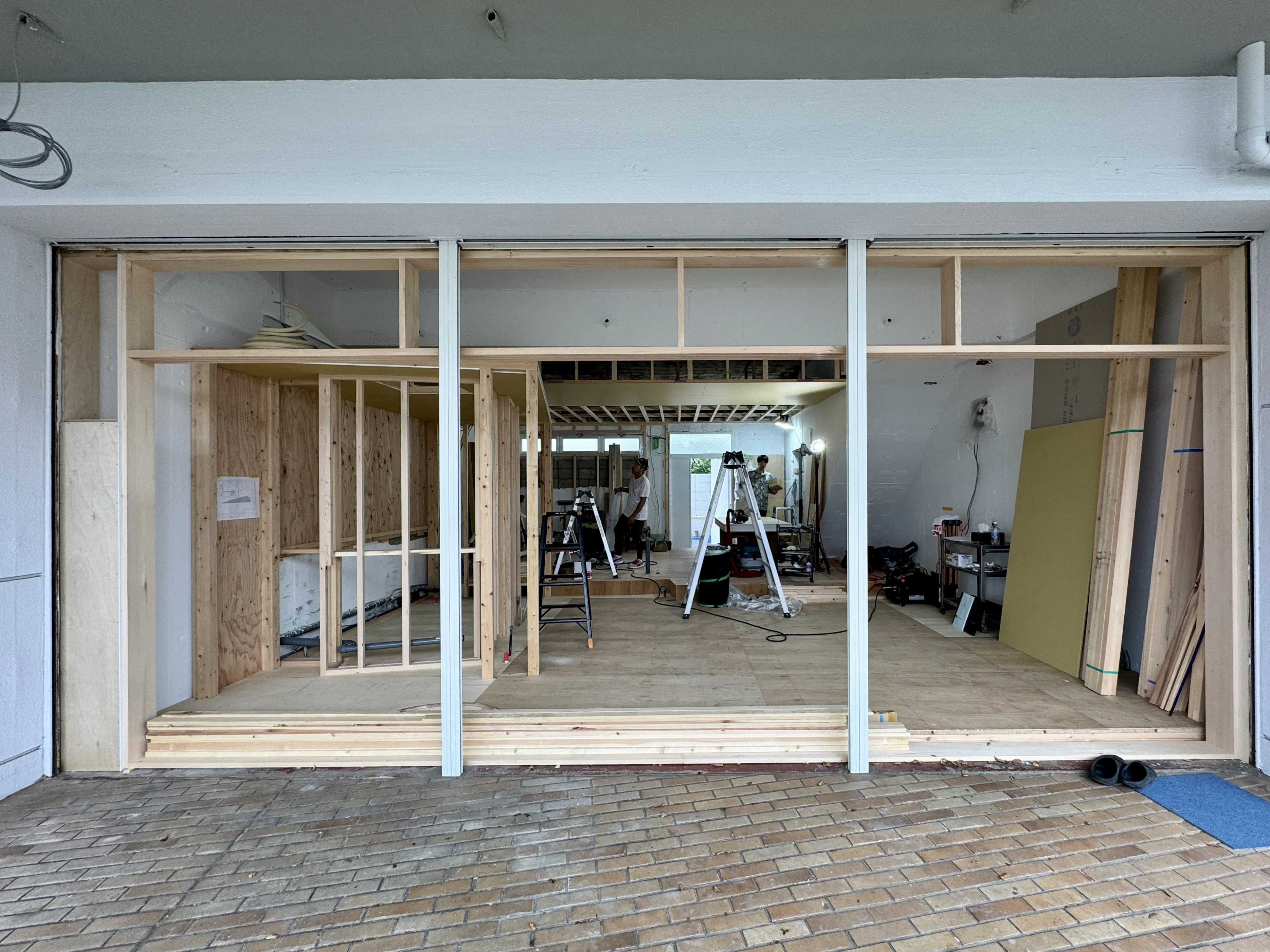 いつの間にか床が組み上がり、天井の骨組みもずらりと並んでいます。