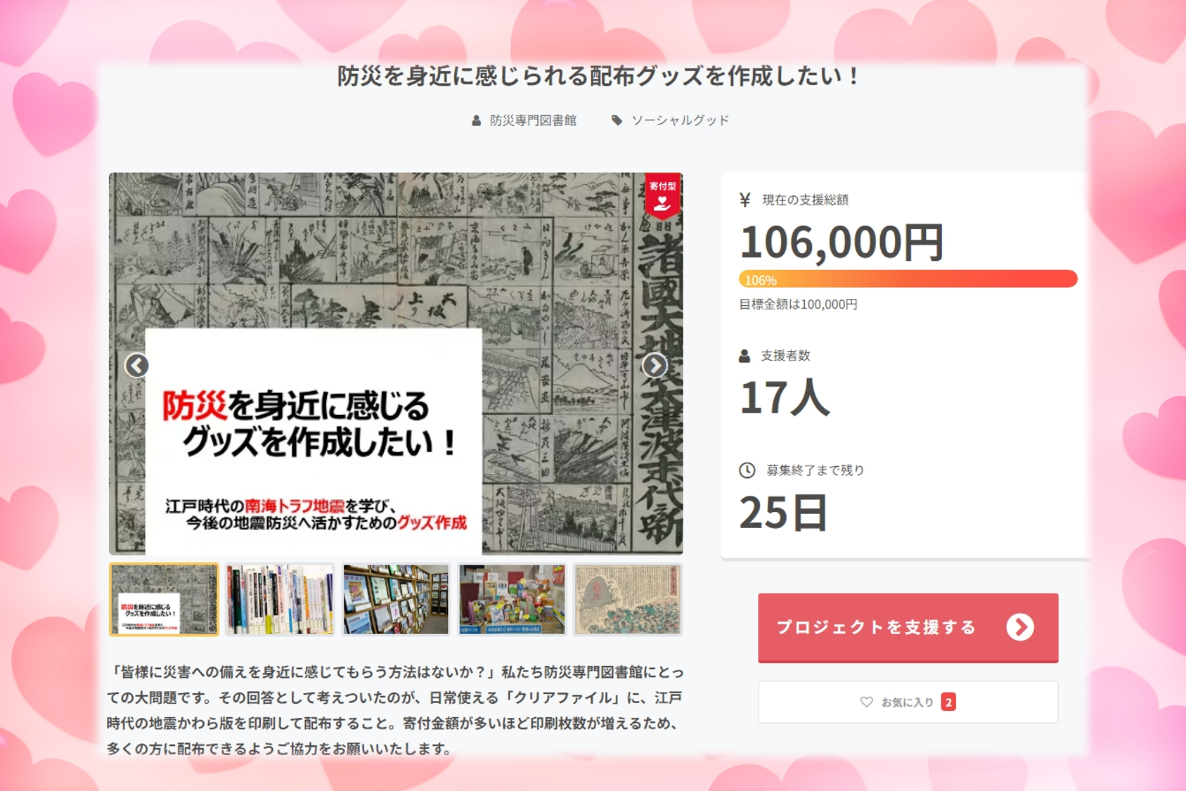 8月31日、防災専門図書館のクラウドファンディング「防災を身近に感じられる配布グッズを作成したい!」が終了しました。おかげさまで、なんと44名の方にご寄付いただき、目標金額10万円を大幅に上回る226,000円ものご寄付をいただきました。皆様の防災への意識の高さに感動しつつ、防災専門図書館へお心を寄せて下さったことに、心から感謝を申し上げます。現在、クリアファイル作成に向けて準備に入っております。・10月末には出来上がり、領収書(寄付金証明書)などと共に、12月にかけてお送りする予定です。・図書館HPへの御名前掲載リターンは、遅くとも11月には実施いたします。・図書館企画展の見学をリターンとされた方には、11月中頃(予定)、当館からメールにてご連絡いたします。経過につきましては、当サイト、そして公式X(https://x.com/bousai_library)にてご報告していきます。どうぞ楽しみにお待ちください。1人でも多くの方が、災害から身を守ることができるよう今後も精力的に資料を収集し、活動してまいりますので、引き続き 、防災専門図書館へのご声援を、よろしくお願い申し上げます。防災専門図書館