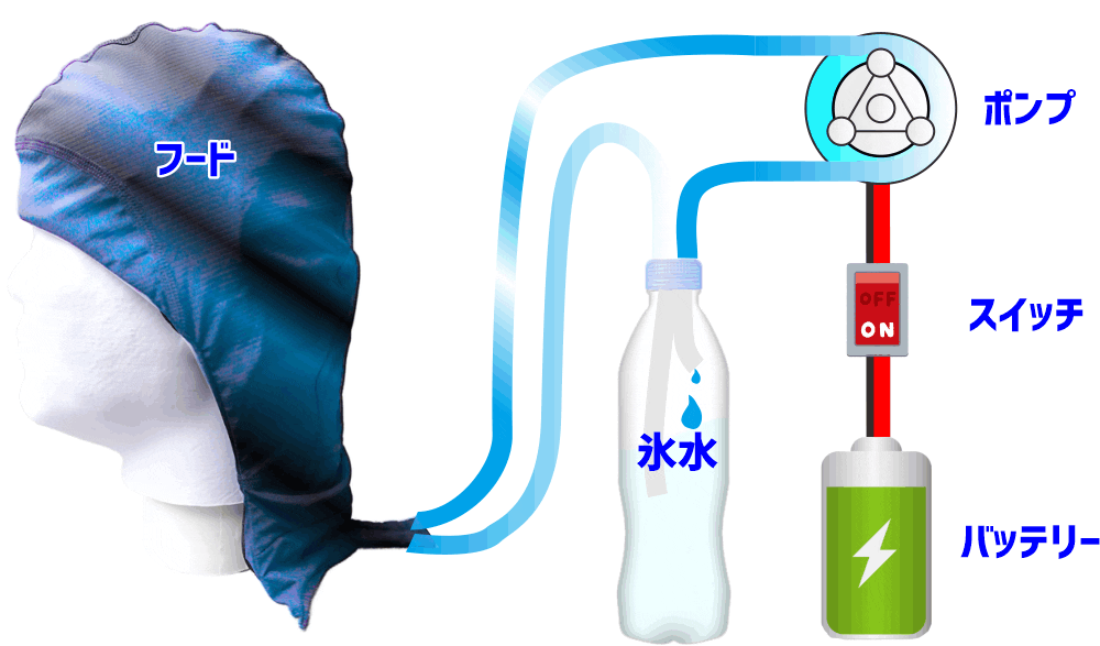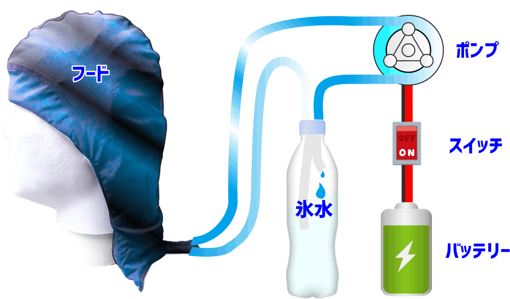 氷水をポンプを使って着衣内を循環し、広範囲の頭部から熱を奪う方式です。極薄なので、軽量メリットがあります。