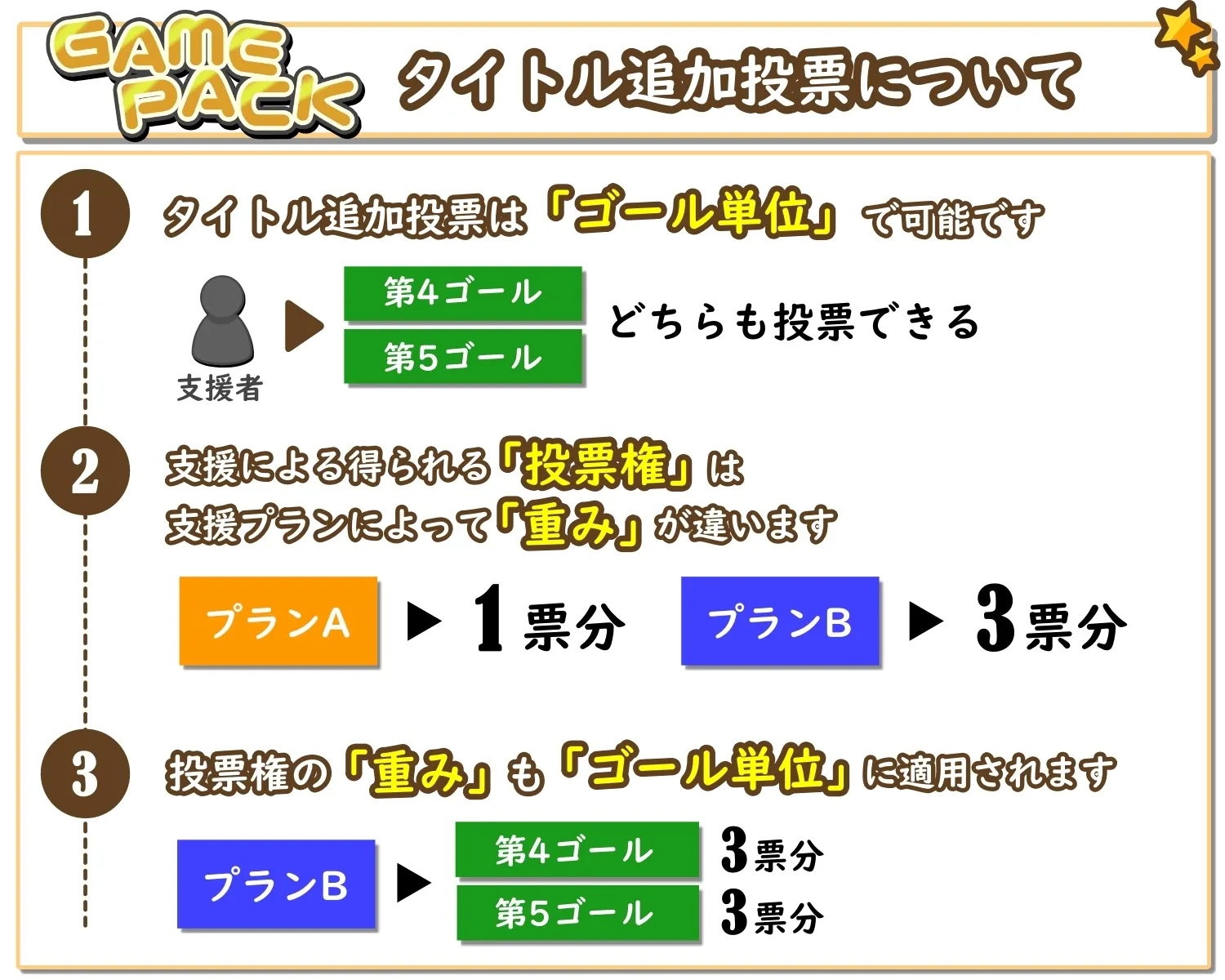 タイトル追加投票は「ゴール単位」で「1回ずつ」可能となっており、複数のゴールに到達した場合、各ゴール単位で別々に投票を頂けます。