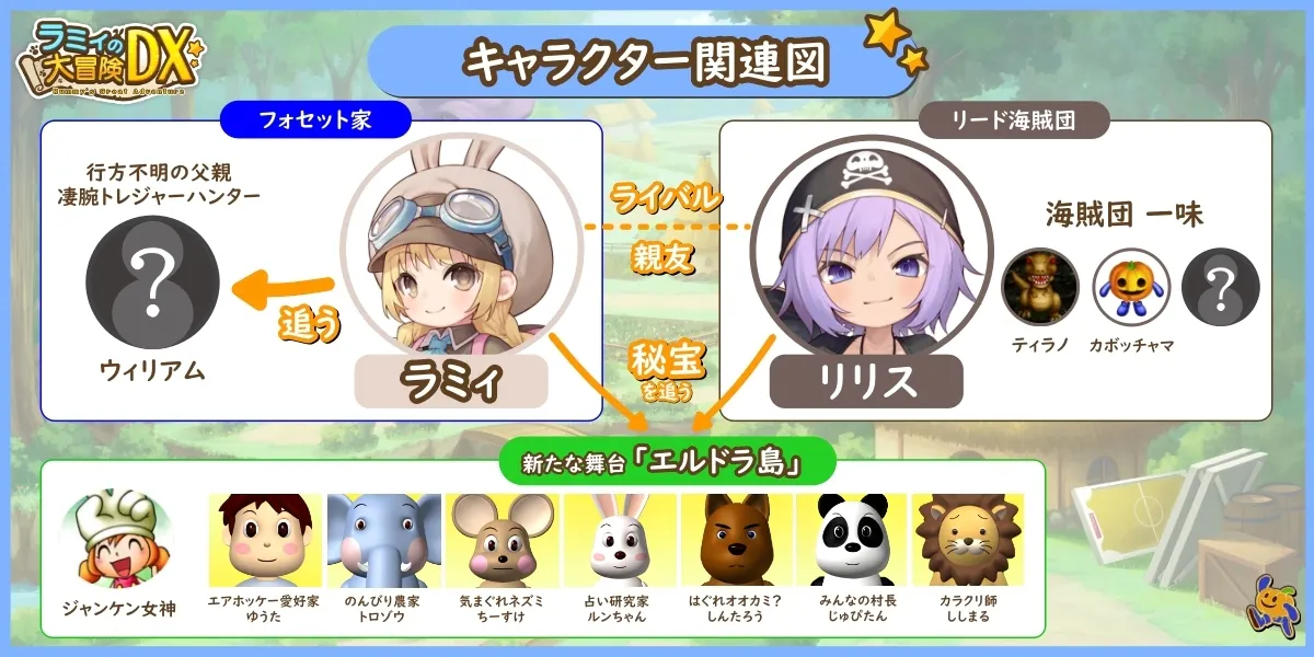 「ラミィの大冒険DX」のシナリオは、秘宝を追うラミィの冒険譚だけではなく「エアホッケー」でおなじみの「ゆうた」や「トロゾウ」などの森の仲間たちが中心となって織りなすオリジナルストーリーが展開されます。