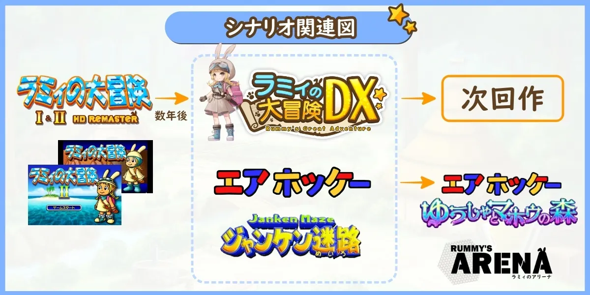 「ラミィの大冒険DX」は「エアホッケー」や「ジャンケン迷路」と世界を共有しており、エアホッケー存在の理由やきっかけを知る事ができます。ジャンケン迷路の「ジャンケン女神」を始めとした新キャラクターも多数登場し、東京ゲームショー等のゲームイベントに出展予定の「エアホッケーゆうしゃとマホウの森」や「ラミィのアリーナ」ともシナリオや設定的な関連も御座います。