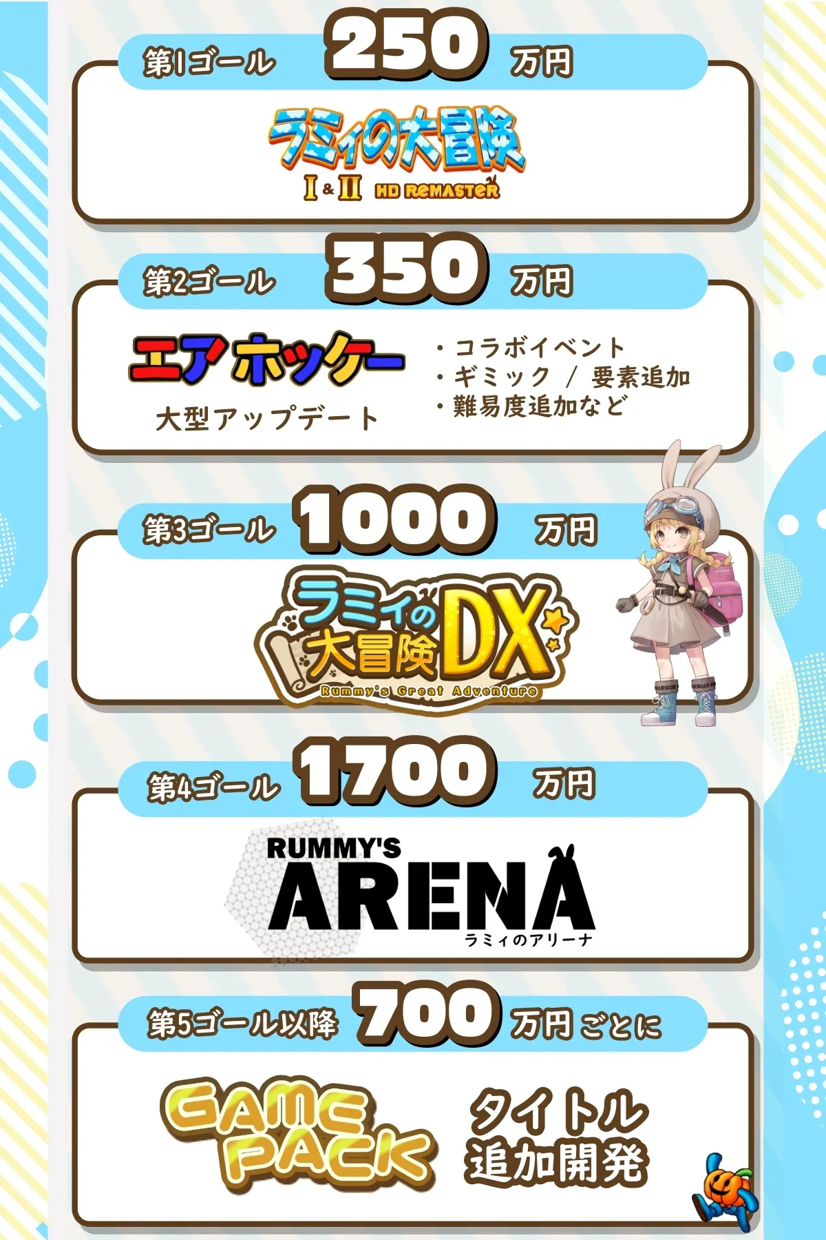 2025/09/26 16:22お世話になっております。GAMEPACKおよびプロジェクト運営チームです。このたび、本クラウドファンディングのプロジェクトの完遂を報告させて頂きます。完遂にたどり着けたのは、ひとえに支援してくださった皆さまのおかげです。心より感謝申し上げます。せっかくの機会ですので、今回は単なるご報告にとどまらず、開発の裏側や次回作DX、今後の活動について、統括の新田からお話しさせていただければと思います。■「 ラミィの大冒険 1&2 リメイク 」開発の裏側を少しだけ先週(9/18)に「ラミィの大冒険1&2(switch版)」が無事リリースされましたが、実はsteam版も含めたラミィの開発は最初から波乱万丈でした。なぜならソースコードも資料も一切残っていなかったからです。エアホッケーもそうですが、当時の開発メンバーは全員退職。残されたのはゲームデータのみでした。ゲーム情報の調査から解析、プレイをひたすらに行ってラミィを知る事から始まった開発でした。実はファンの方がまとめてくださった攻略サイトにも助けられていたりもします。素材については、データを抜き出し、AIでドット絵を高画質化。時には足りないところをうまく書き足したりもして、用意を進めていきました。そして、並行して新たな言語(unity)で開発したダンジョンRPGエンジンへ、集めたデータや素材を乗せ、ラミィプロトタイプが完成しました。ここからは原作の挙動を見ながら触りながら、原作の再現に徹しました。ゲーム機の仕様や開発言語が異なる事から再現が難しいものもいくつかありましたが、高い再現度で作れた…のではないでしょうか。評価は皆さんにお任せ致します。その後、着々と開発を進めていき、無事各プラットフォーム審査へ進みましたが何度もはねのけられました。何度もごもっともな不具合や不備を突き付けられ、少しだけ挫けそうになりました。風の噂でゲームの審査はそこまで厳しくない…と囁かれていましたが、そんなことはありません。審査員の方々はしっかりみっちり審査されており、立派な門番として君臨しています。ですが、突きつけられる指摘を一つひとつ解決し、最終的に審査を通過した時の喜びはひとしおでした。予定の8月からは若干遅れてしまいましたが、皆さんに提供出来てホッとしております。完成した作品にはストーリー追加、オンラインランキング、図鑑、カラー変更など新要素を詰め込みました。カラー変更はデータを抜き出した際にうまい事工夫すれば、色違いを量産出来る事が気が付いて実装が決まったり、オンラインランキングもエアホッケーのランキングをベースに移植すれば工数が抑えられるのでは…というところから実際に抑えられたのでさっと実装してみたり…と、閃きや工夫で期間内に対応した背景があったりします。ただストーリーと図鑑は気合いで実装しています。そして、図鑑では、これまで語られなかったラミィの世界観や設定も記されています。ラミィの友達のオウムの名前「ラパン」、ラミィの父「ウィリアム・フォセット」など、次回作DXへつながる布石も一部あります。私の個人的なオススメはDXに全然関係ないですが「ツノトカゲ」の設定です。是非注目してみて頂ければと存じます。◆エアホッケー×キヨ猫コラボについてコラボということで、あまり大きくはこちらのプロジェクト報告には書けないのですが、最後なのでお許しください、という事でお話しさせて頂きます。前回のonちゃんコラボから気づかれた方もいるかもしれませんが、実は「北海道縛り」でコラボ先を選定していました。その中で真っ先に浮かんだのが、エアホッケーを一躍有名にしてくださった北海道出身の絶対王者ゲーム実況者「キヨ」さんです。善は急げ、ということで、思いついた日に連絡を行ってみたところ、前向きなお返事をいただき、今回のコラボを実施する流れになりました。実際、キヨさんご自身の動画内でも語られている通り「キヨ猫、エアホッケーに出しませんか?」という軽い一言から始まった話でありながら、結果として実現まで至れたことには、私たち自身が一番驚いていたりします。その影響力は凄まじく、Xでトレンド入りするほどの盛況ぶりを見せ、支援者の皆様も驚かれたのではないでしょうか。ただ…キヨさんのエアホッケーの腕前は“異常”としか言えず、絶対王者モードは苦戦必須だろうと想定していたのに、あっさりとクリアされてしまいました。もっと難易度を上げてもよかったのでは…と後悔する一方で、一般の方々にとっては十分に手ごわい難易度ですので、結果的にはこれで良かったのだと思っています。なお、この「キヨ猫コラボ」は12月下旬まで遊び放題となっています。是非お時間のある時にアクセスし、絶対王者のキヨ猫に挑んでいただければ幸いです。◆次回作DXの予定について実を言うと、次回作「ラミィの大冒険DX」については、すでにシナリオのプロットや世界観の設定が完成してお