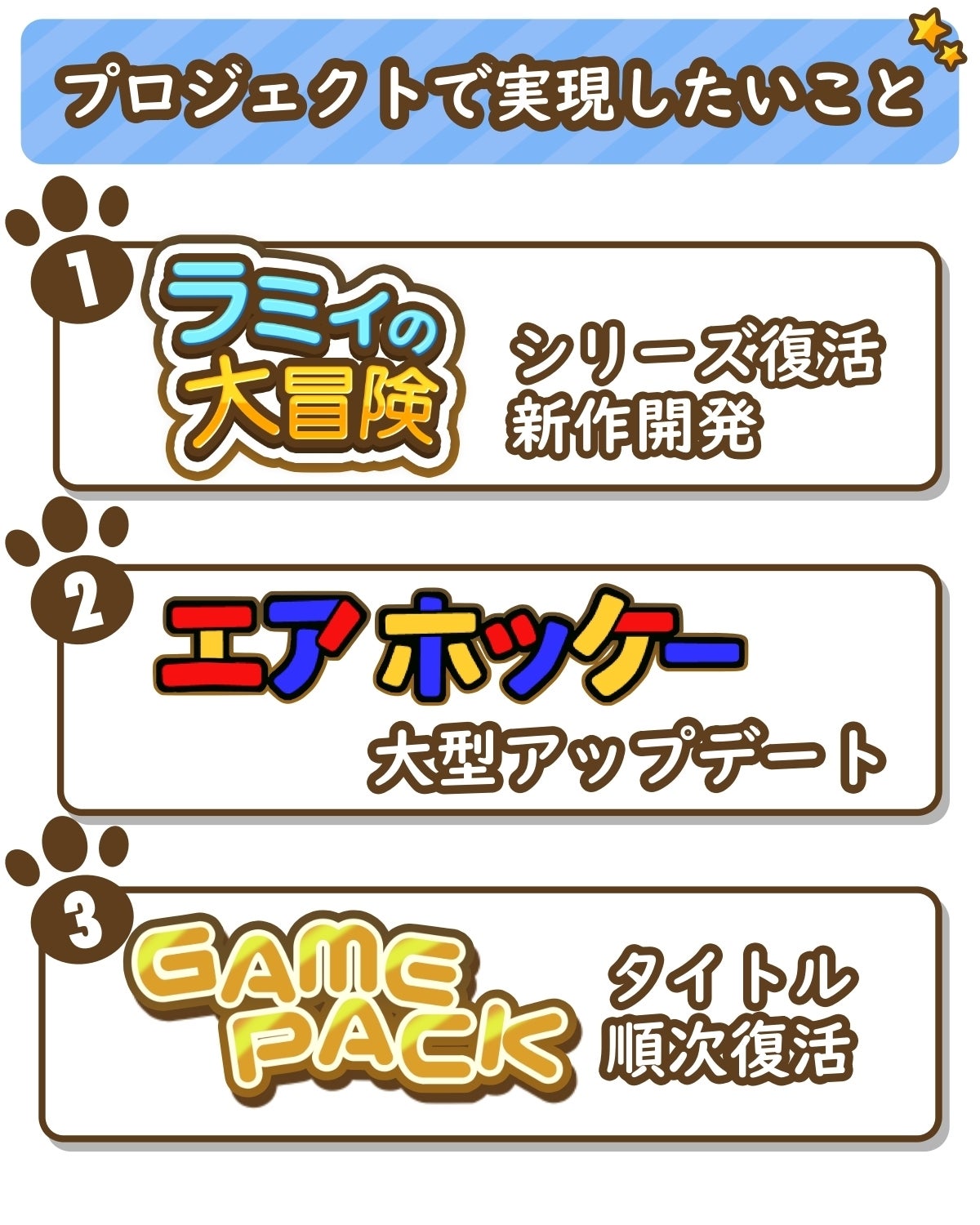 これまで「GAMEPACK」に内包されてきた各ゲームタイトルを到達額に応じてゴールに追加し、順次復活させていきます。復活させるタイトルは支援者限定の投票によって決まり、リマスター・リメイク・完全新作のいずれかでの復活となります。