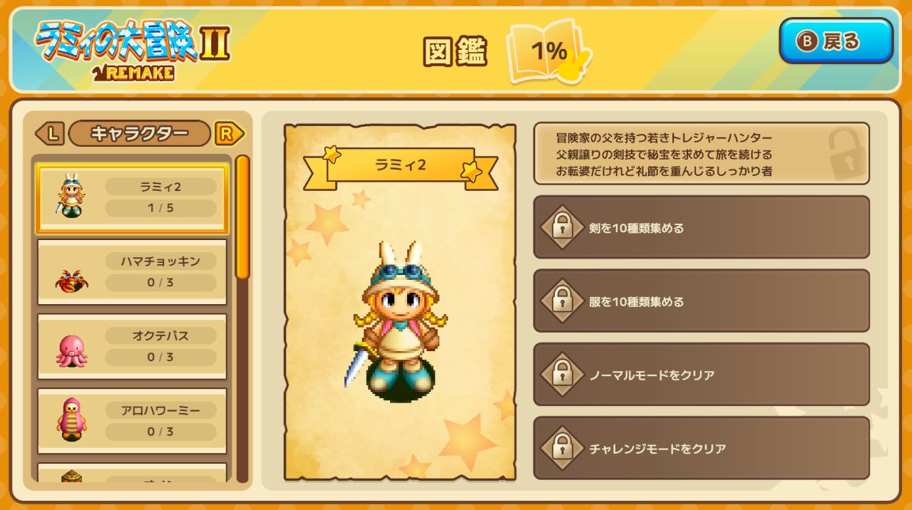 これまで語られる事が無かったキャラ設定や世界観が垣間見える内容となっており、図鑑の解放状況(%)に合わせて、後述のラミィのカラーが追加されます。本作のやり込み要素にもなりますので、コンプリートを目指してみて頂ければ幸いです。