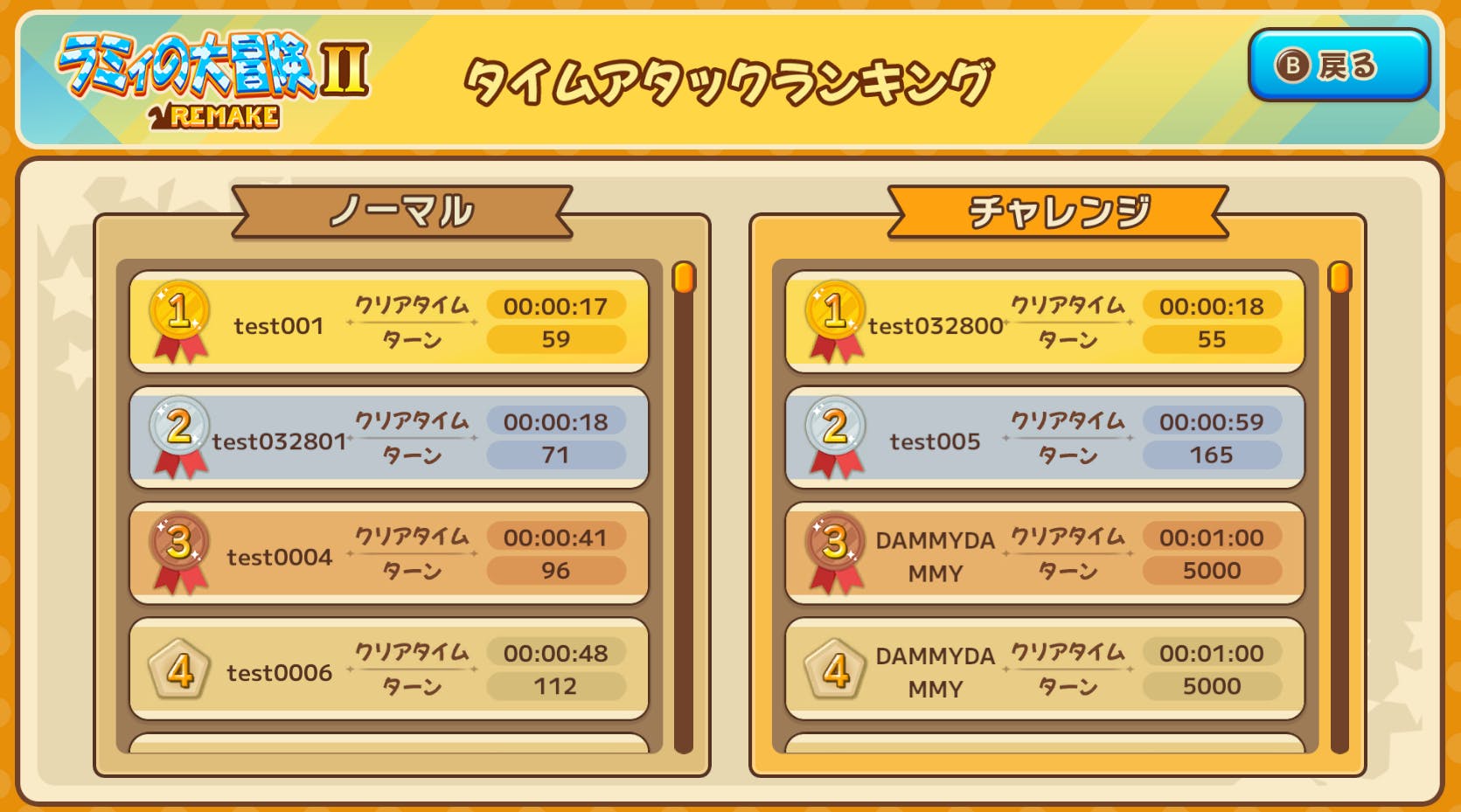 クリアタイムと消費ターンを基準にしたオンラインランキングを搭載しました(画像はテスト及びダミーデータとなります)。