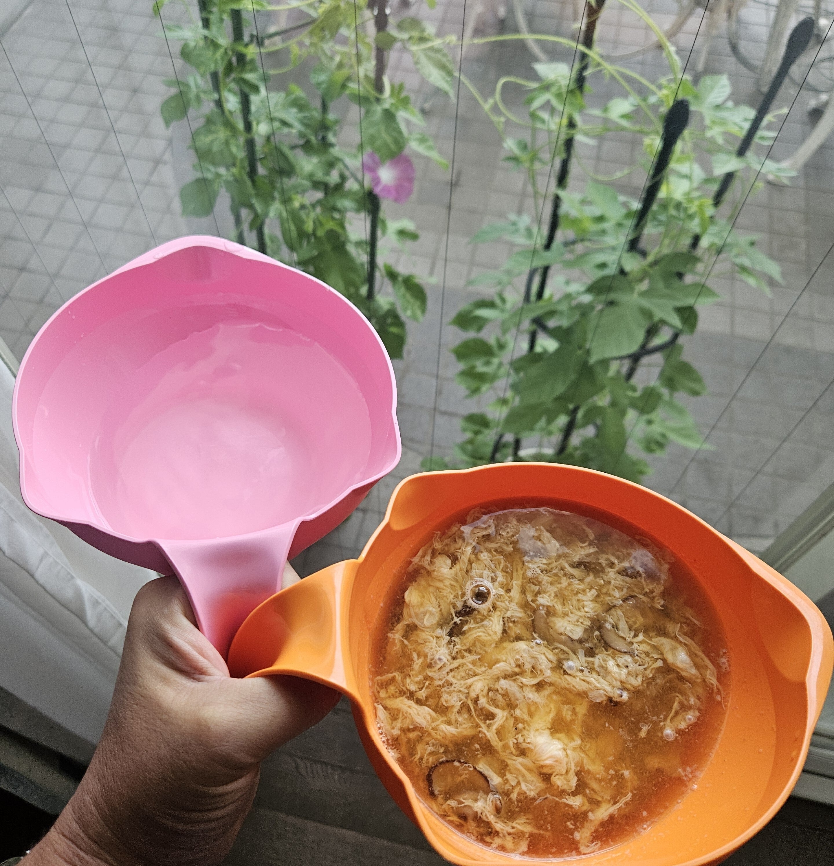 朝:あさがおの水やり かきたま汁 必殺2鉢持ち!