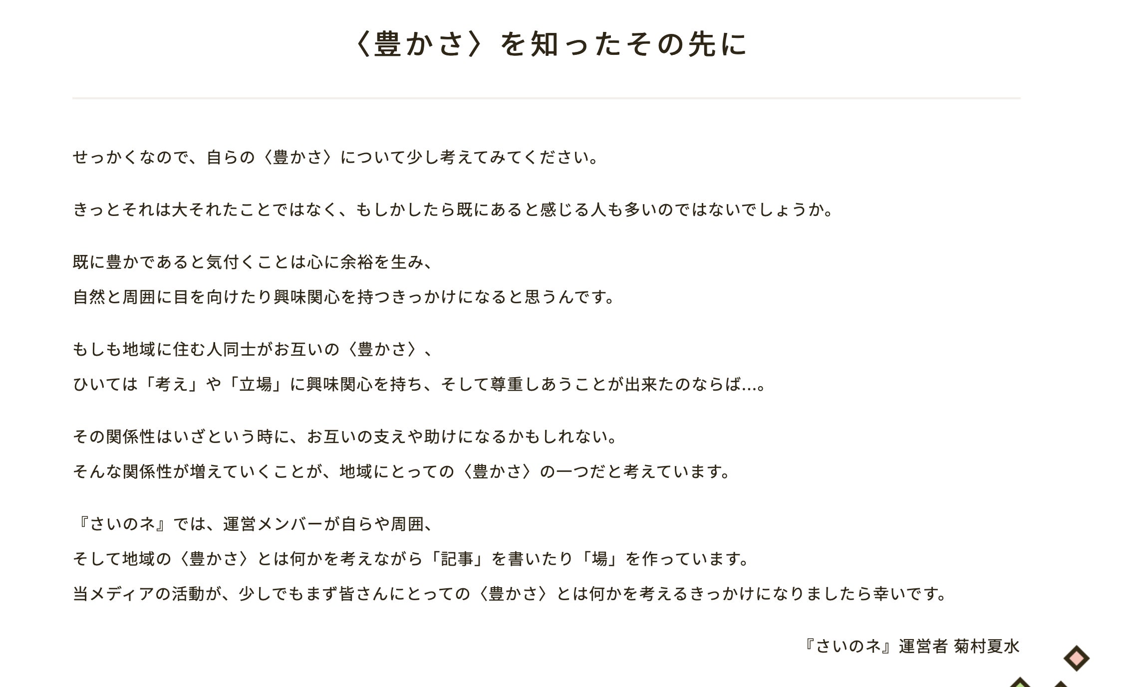 そんな問いから"等身大の視点から豊かさについて考える"というコンセプトを掲げた、ローカルWebメディア『さいのネ』の構想は始まりました。