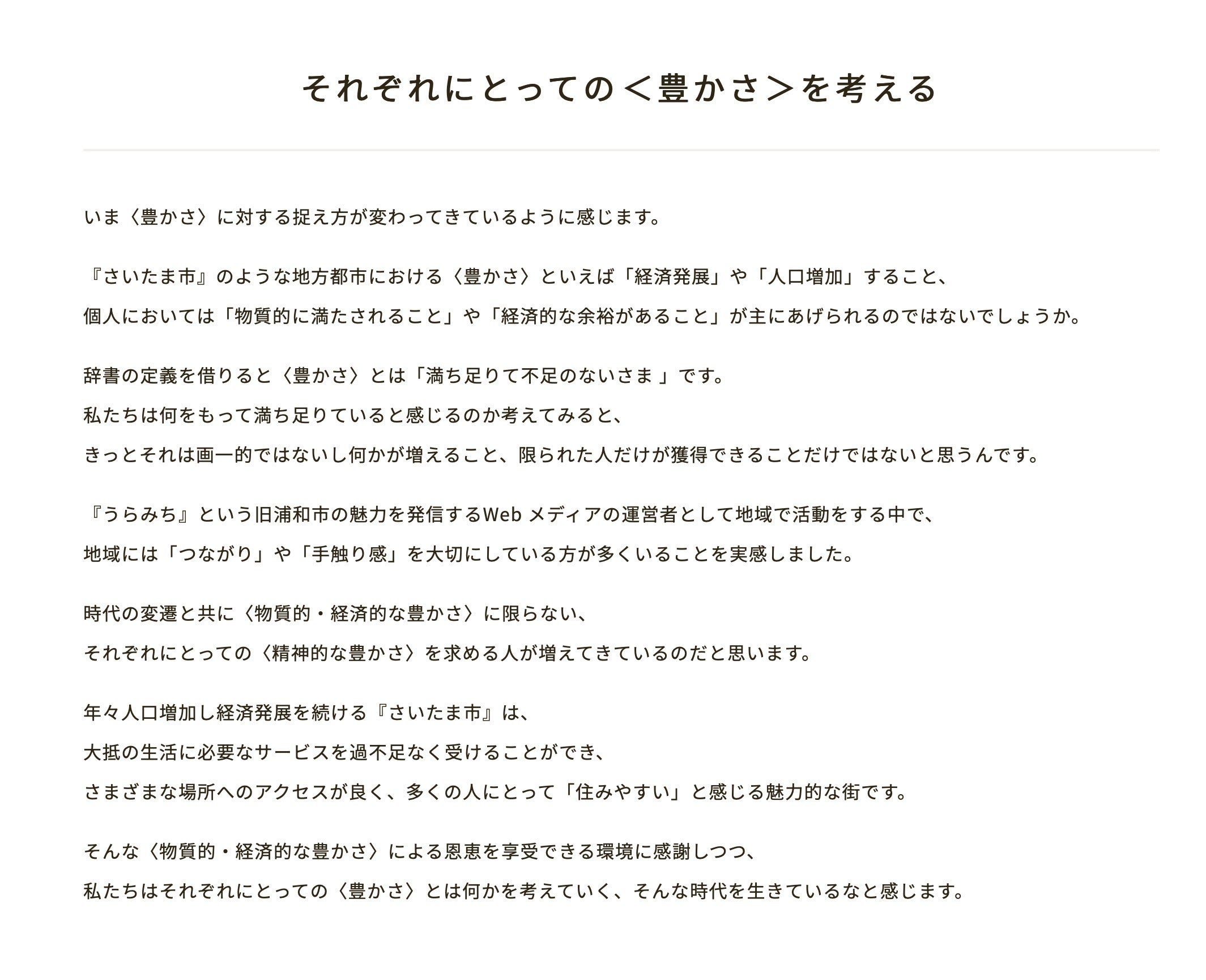 130万人以上の人が居住し、アクセスの良さや充実した公共サービスが提供される環境から「住みやすい街」と評される『埼玉県さいたま市』。年々、人口増加と経済発展が進む一方で比例するように地域の声は行政に届きにくく、人と人の関係は希薄になっているように感じます。