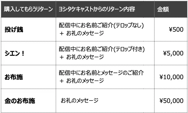 購入のリターン:配信中にお名前ご紹介(テロップなし) + お礼のメッセージ