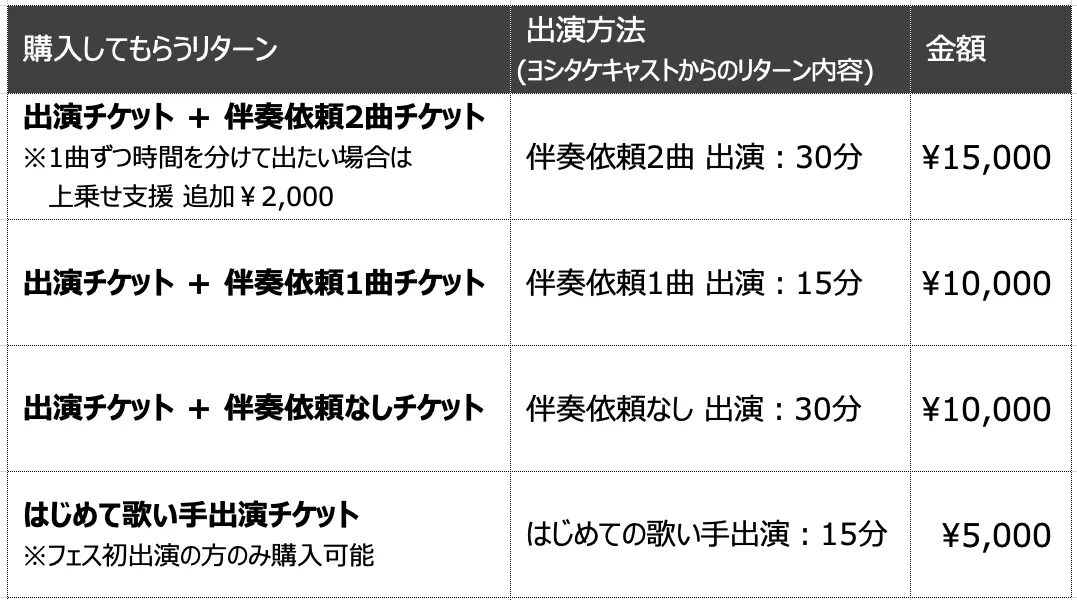 購入方法は、チケットを2つ買う必要があり、「 出演チケット + 伴奏依頼2曲チケット」リターンの購入が条件です。