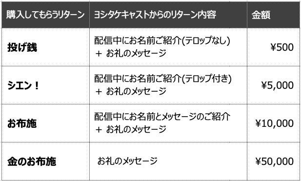 購入のリターン:配信中にお名前ご紹介(テロップなし) + お礼のメッセージ