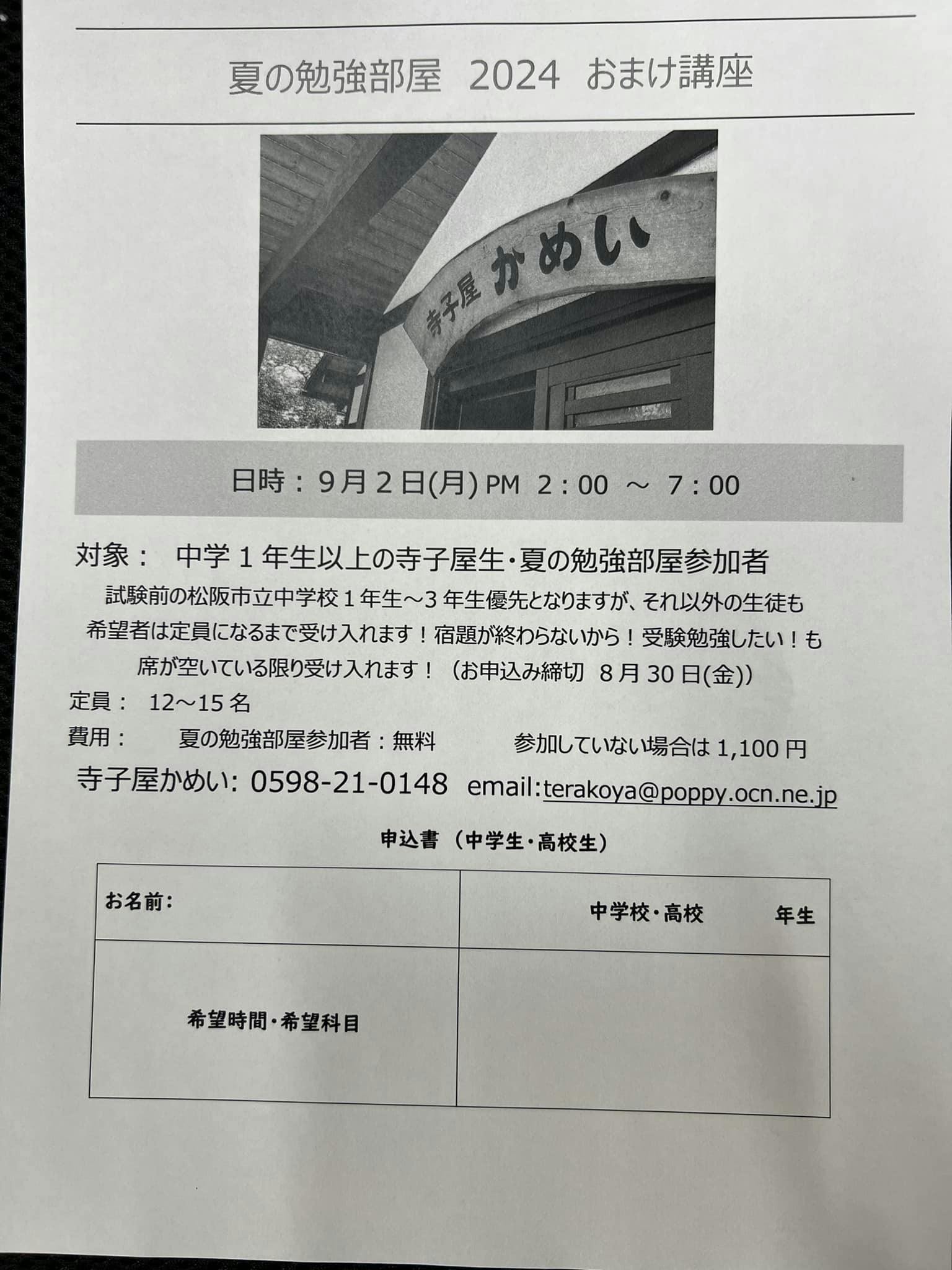 松阪地区の公立中学校は9月の最初の週に「前期末試験」が行われるので、その勉強や宿題のラストスパートなどに利用してもらえる時間にすることにしました。