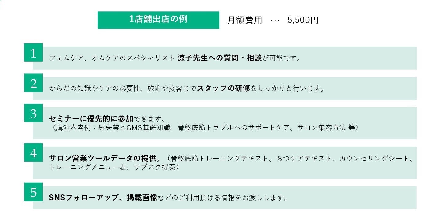 「骨盤底筋群トレーニングマシン」を購入するだけでなく、経験豊富な企業家たちが、マーケティングや運営についての具体的なプランやアドバイスをします。