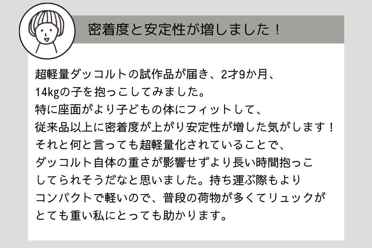 現行のダッコルトの使用感や安全面での満足感をそのままに、とにかく軽量、コンパクトを目指しました。