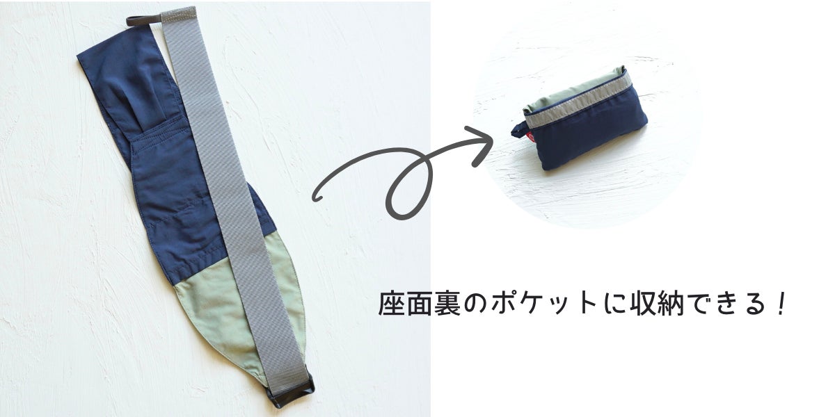 収納時は座面裏のポケットに包むように収められ、付属の袋などを紛失する不安もなく、簡単に小さくまとまります。一方、使用時に展開する時は、座面や肩ひもに芯地を入れ(特許出願中)、パッと開くよう工夫してあるため、軽量で柔らかい素材でも装着のまごつきが無くなり、スムーズに素早く抱っこすることができます。このパッと開く形状の工夫が、開発において一番悩んだ点かもしれません。