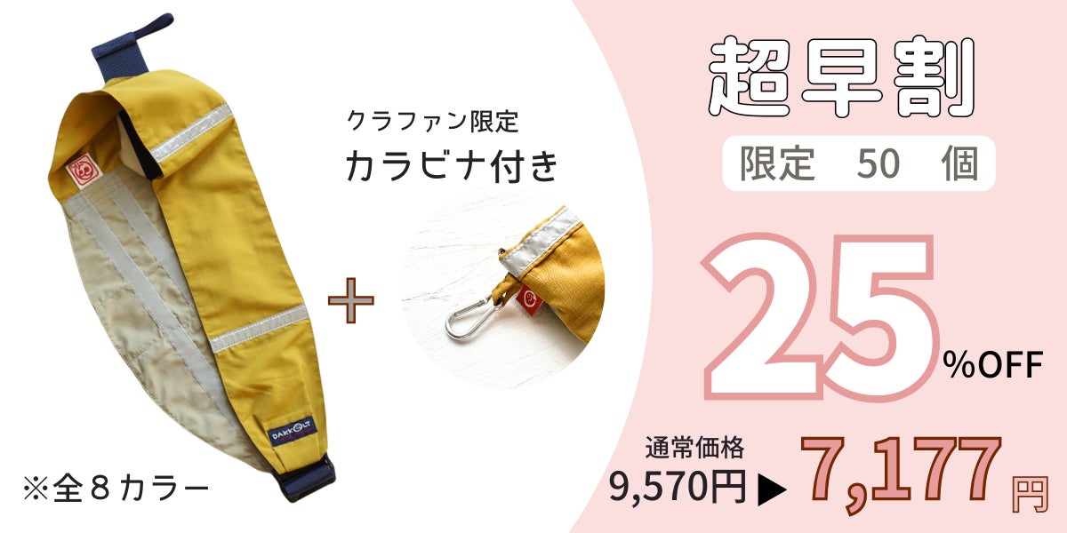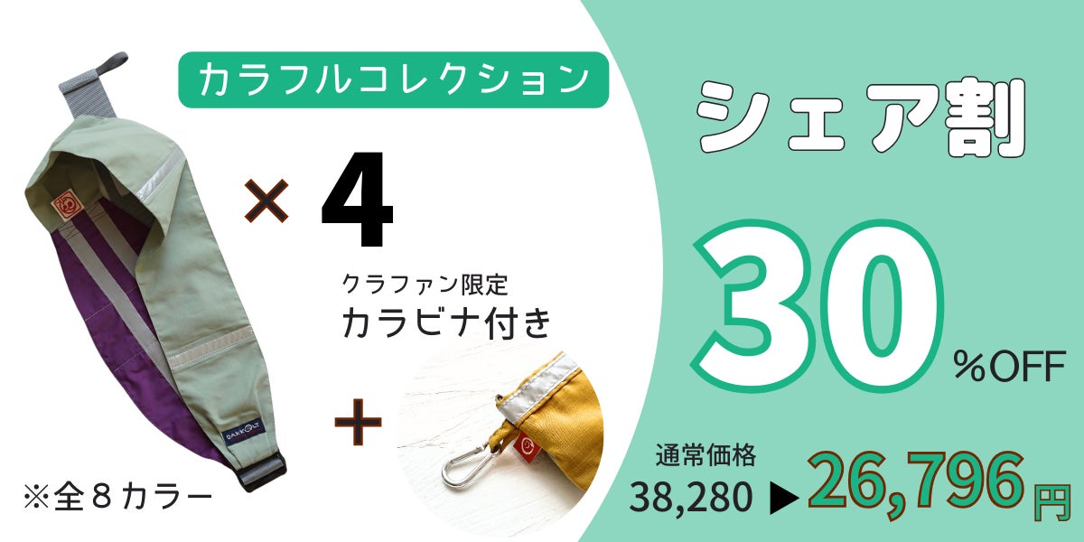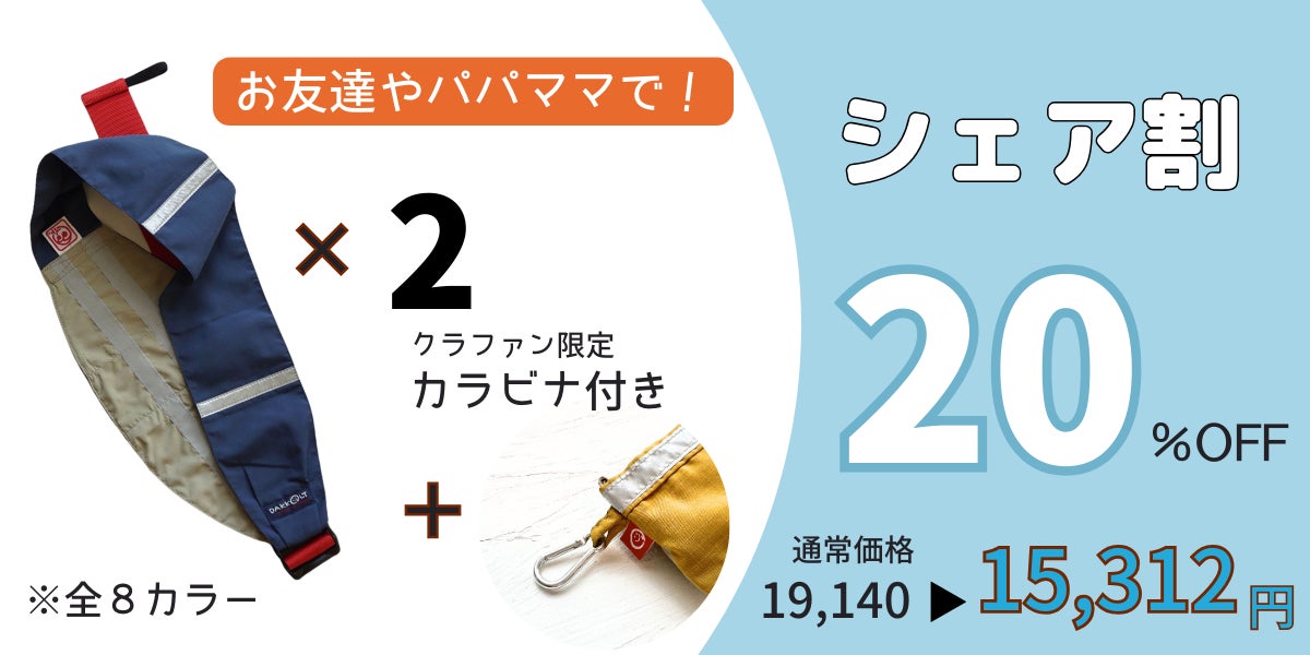 数量限定の超超早割(~35%OFF)、早割(15%OFF)のご提供の他、お友達やパパママで一緒に!!シェア割のセットもご用意させていただきました。全てのリターンに、クラファン限定!ダッコルト80の持ち運びに便利なカラビナをお付けします。
