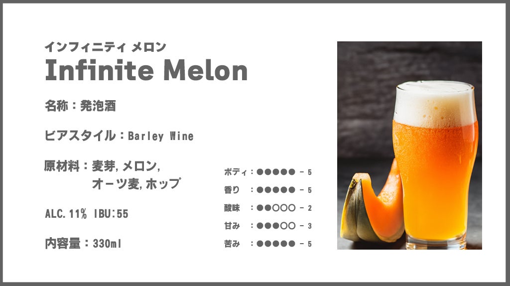 無限の風味と深い味わいを持つ長期熟成メロンビールの特徴を強調しています。加えて、エレガンスと魅力があり、飲む人に特別な体験を予感させてくれます。
