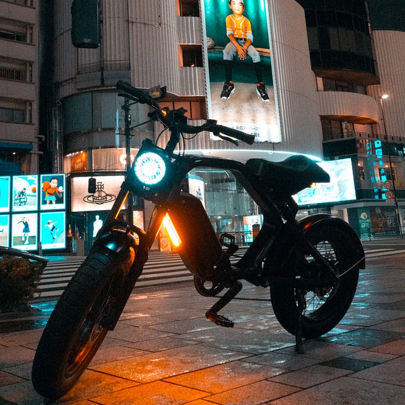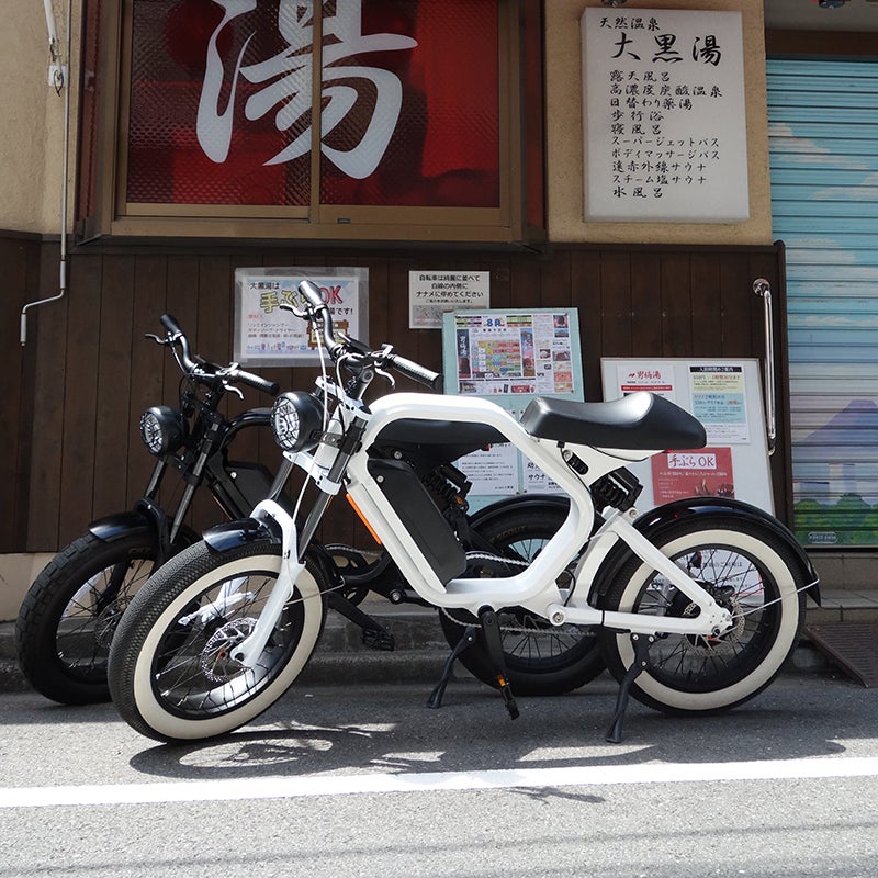 A: 通常モデル(48V/14AH)/エコモードで80km程度の走行が可能です。*拡張バッテリー(48V/21AH)搭載し最大110km程度までカスタム可能ですです。