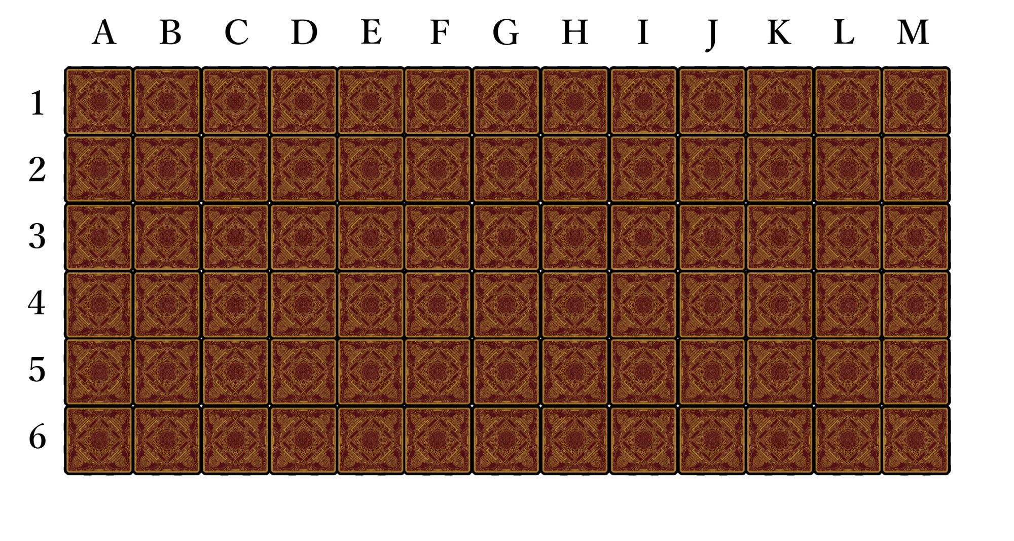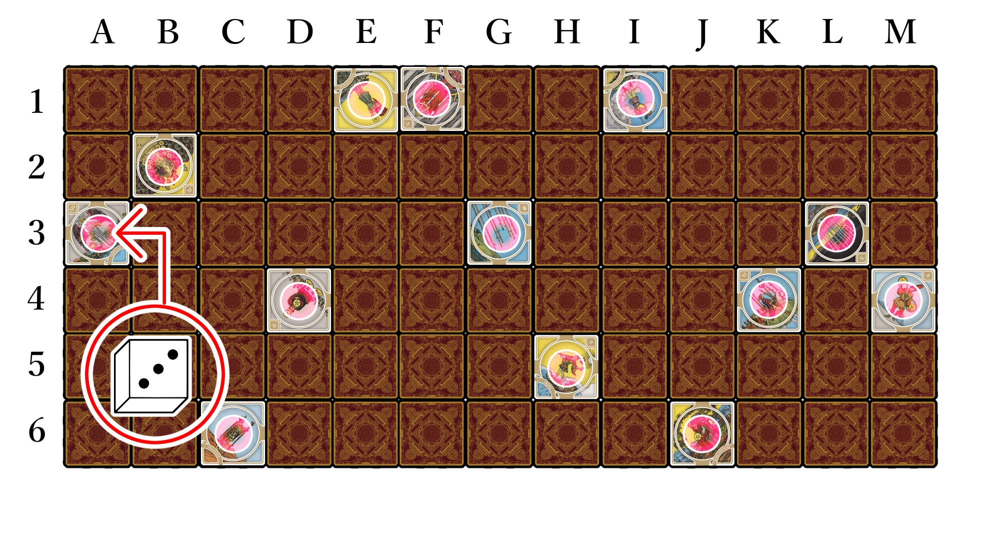 ②賽を振り、A列目の出た数枚目の札を表に返しトークンを置く。M列目まで繰り返す。