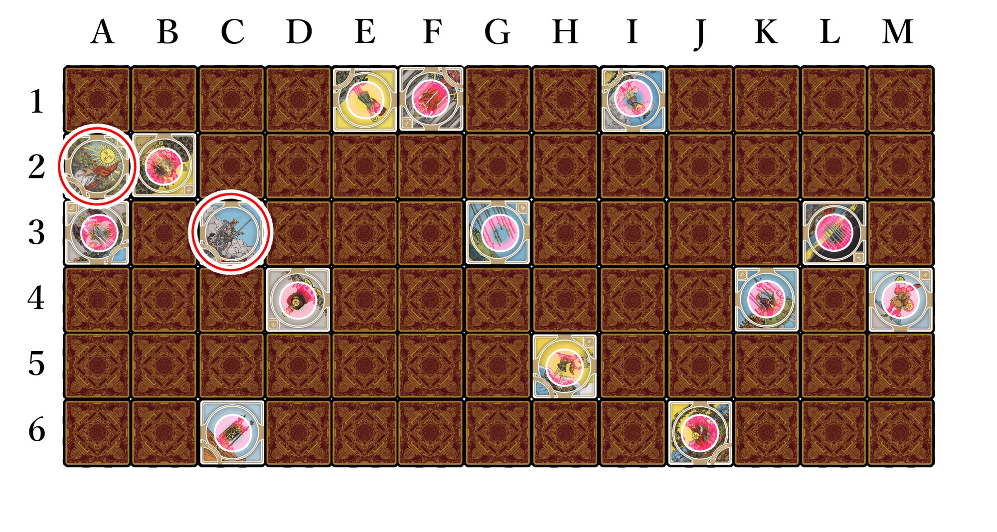 トークンが置かれた札は微かに残った夢の記憶。これを起点に札を開いて行く事で、夢の記憶を思い出して行く様子を表している。