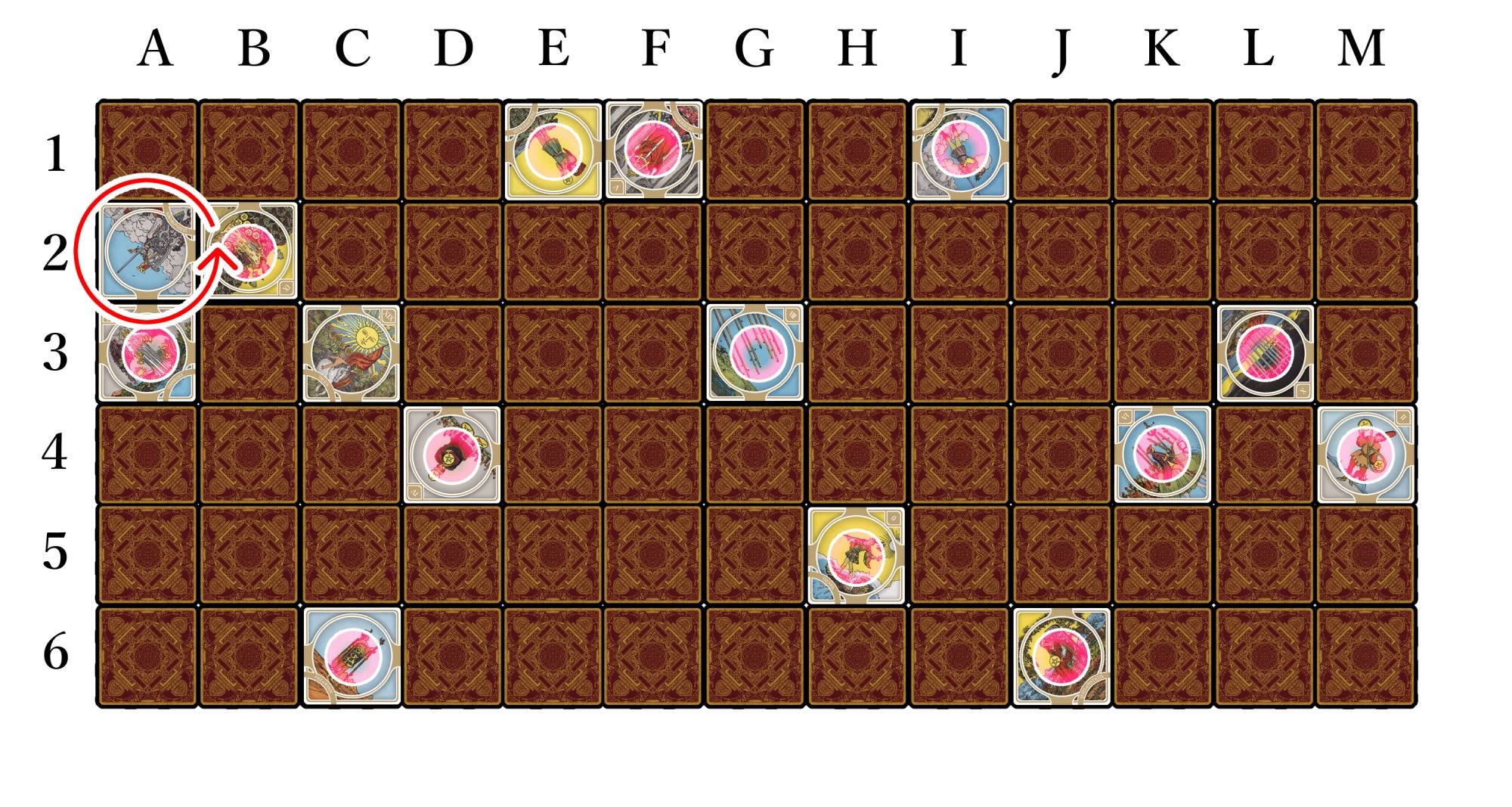 ①伏せられている札2枚を表に返す。内1枚は既に開けられている札に隣接したものでなくてはならない。