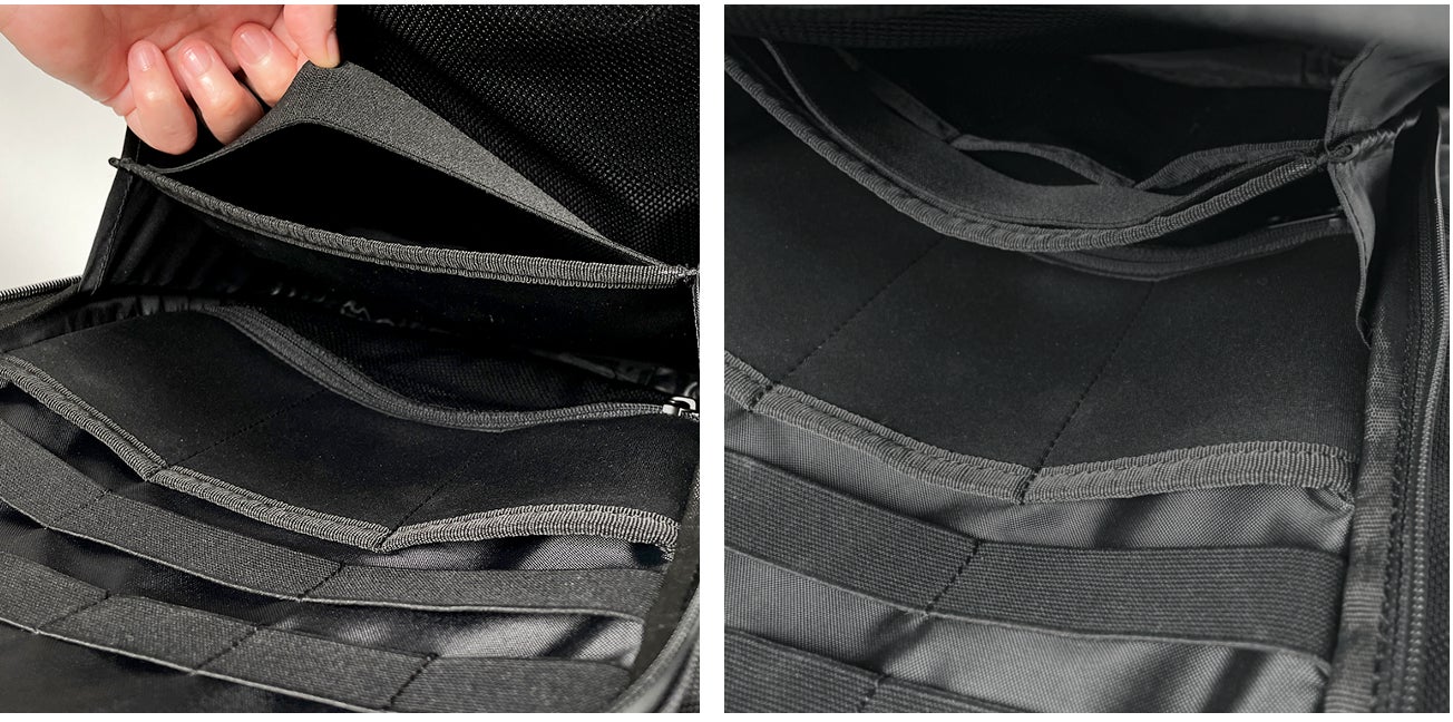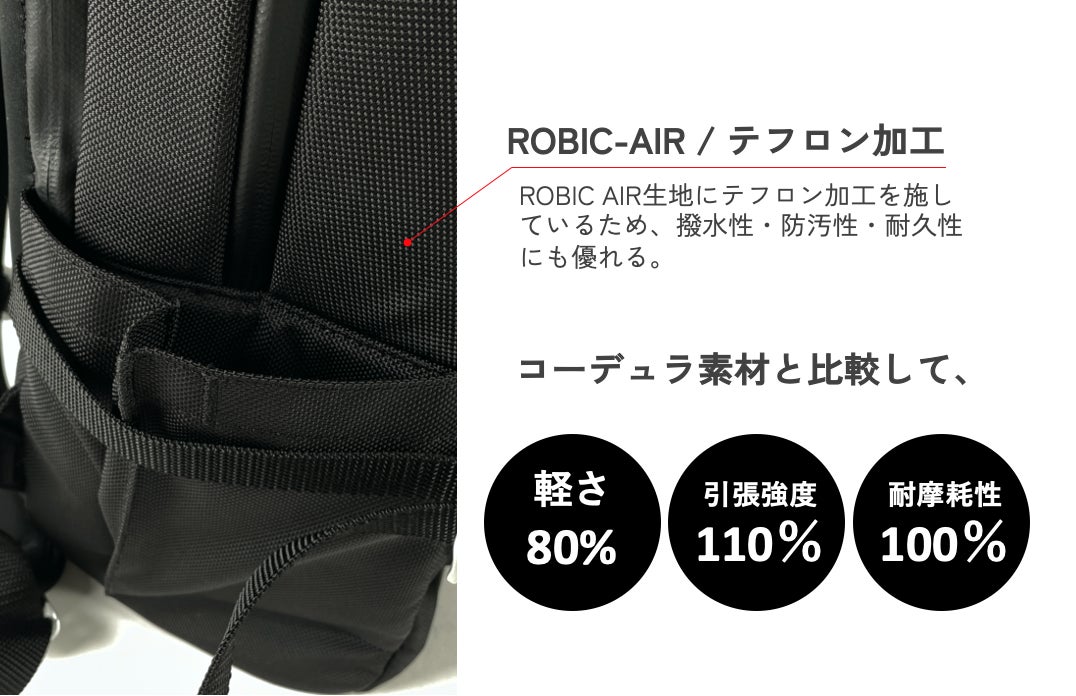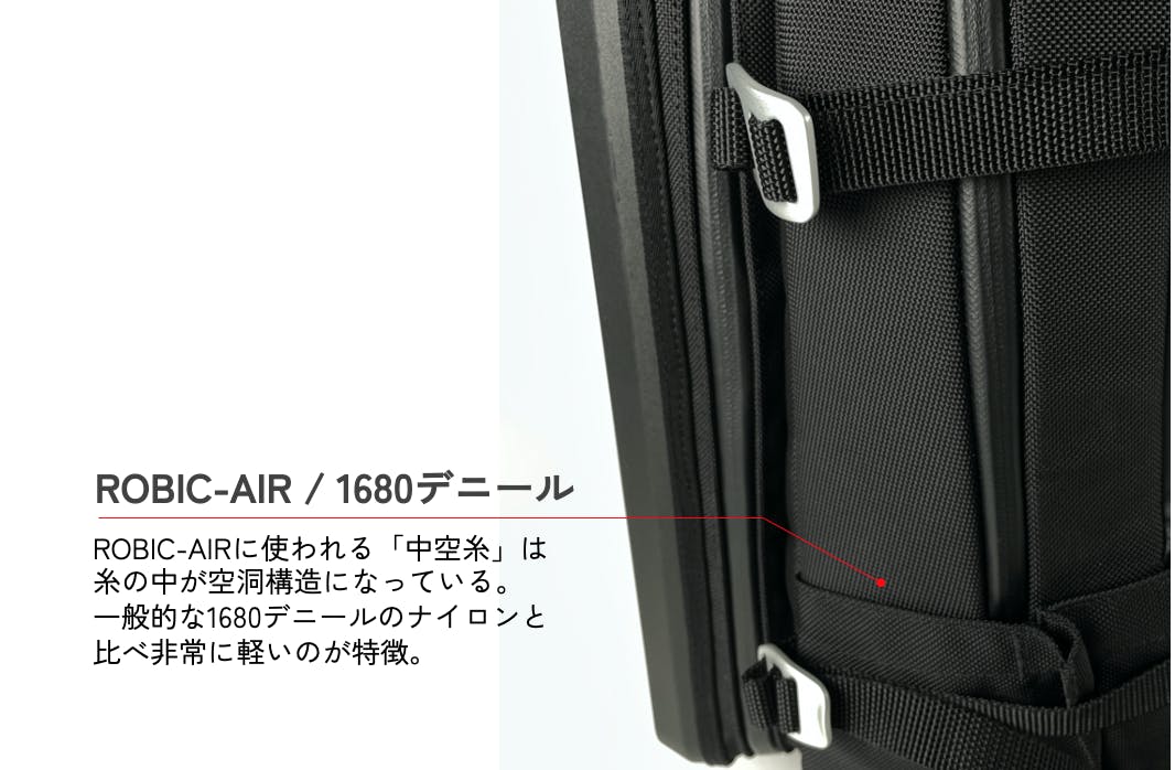 生地には、1680デニールのROBIC-AIRを採用。ROBIC-AIRに使われる糸は「中空糸」といって糸の中が空洞になっている構造のため、一般的な1680デニールのナイロンと比べ非常に軽いのが特徴です。