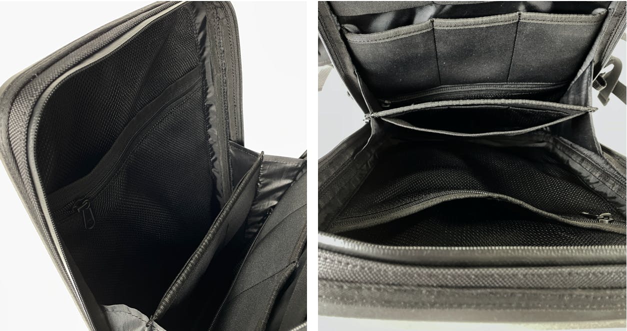 対してアルミプレート側は、メインポケットとファスナー付きのサブポケットのシンプルなつくり。