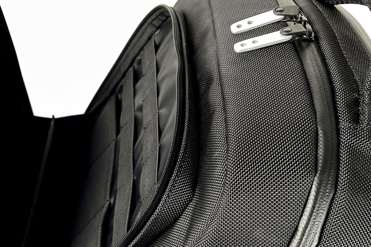ファスナーはすべて「止水ファスナー」を採用。本体生地は1680デニールのROBIC-AIRにテフロン加工を施しているので、急な雨に降られても安心感があります。