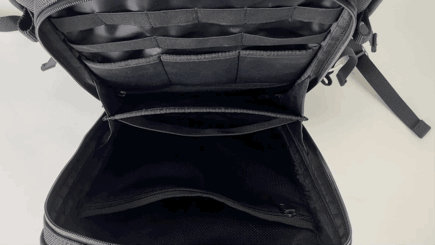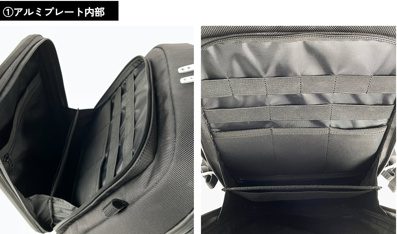 アルミプレート内部は、細々としたギアを収納するための4cm幅のゴムバンドループが全6箇所。その下には8cm幅のゴムバンドループが全3箇所。その下には幅8cm深さ12cmのポケットが3つ続き、最下部に深さ12cmファスナー付きポケットがひとつ。