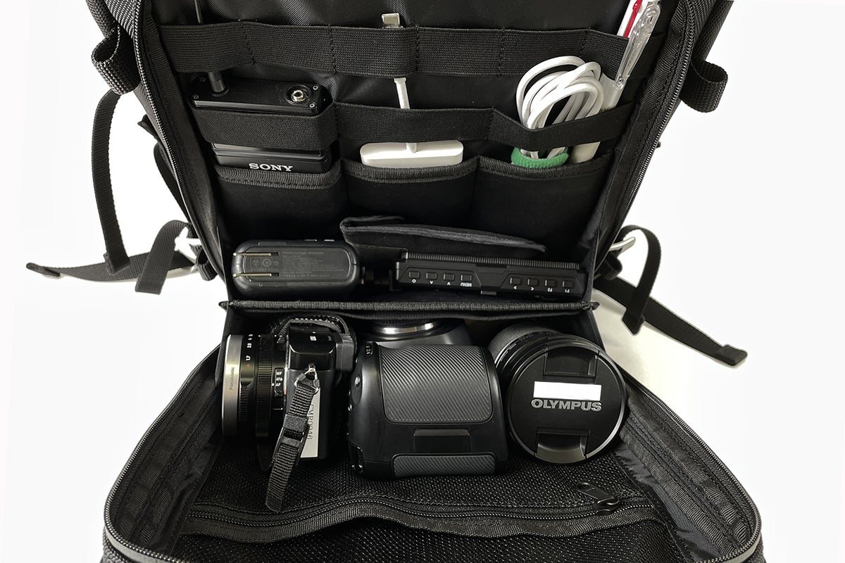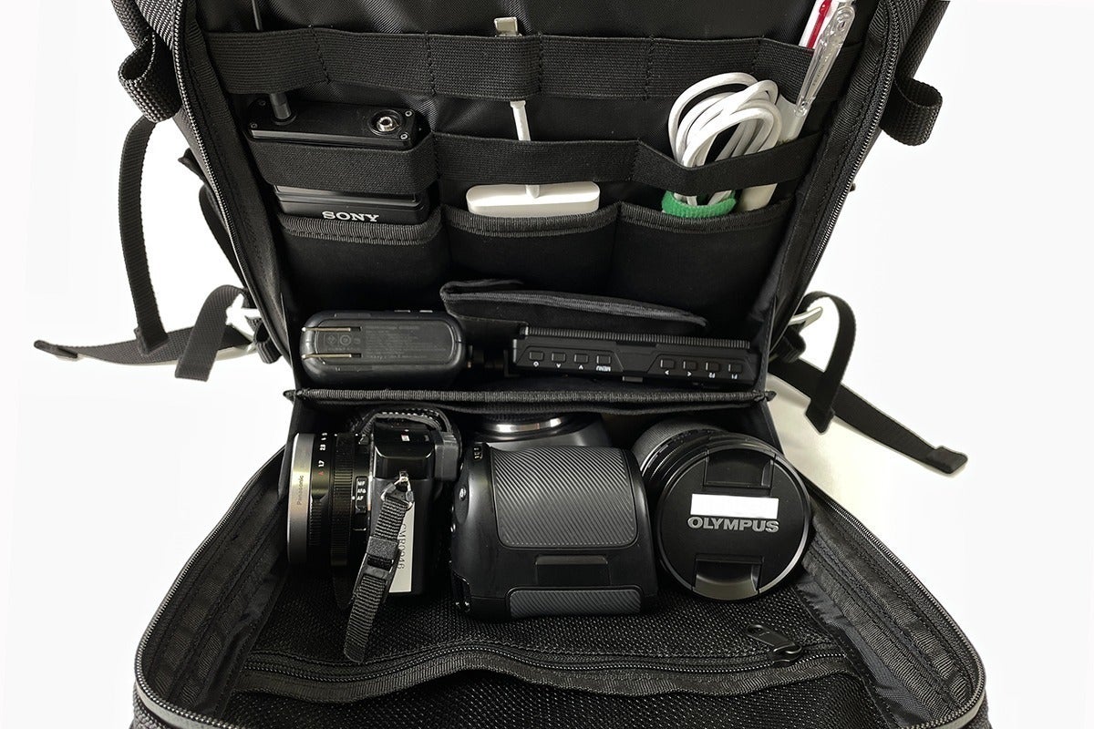 例えば、カメラ周りの機材を収納してみると、こんな感じ。カメラを入れている部分はマチがしっかりしているので上から垂直にすっぽりと入り自立します。
