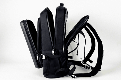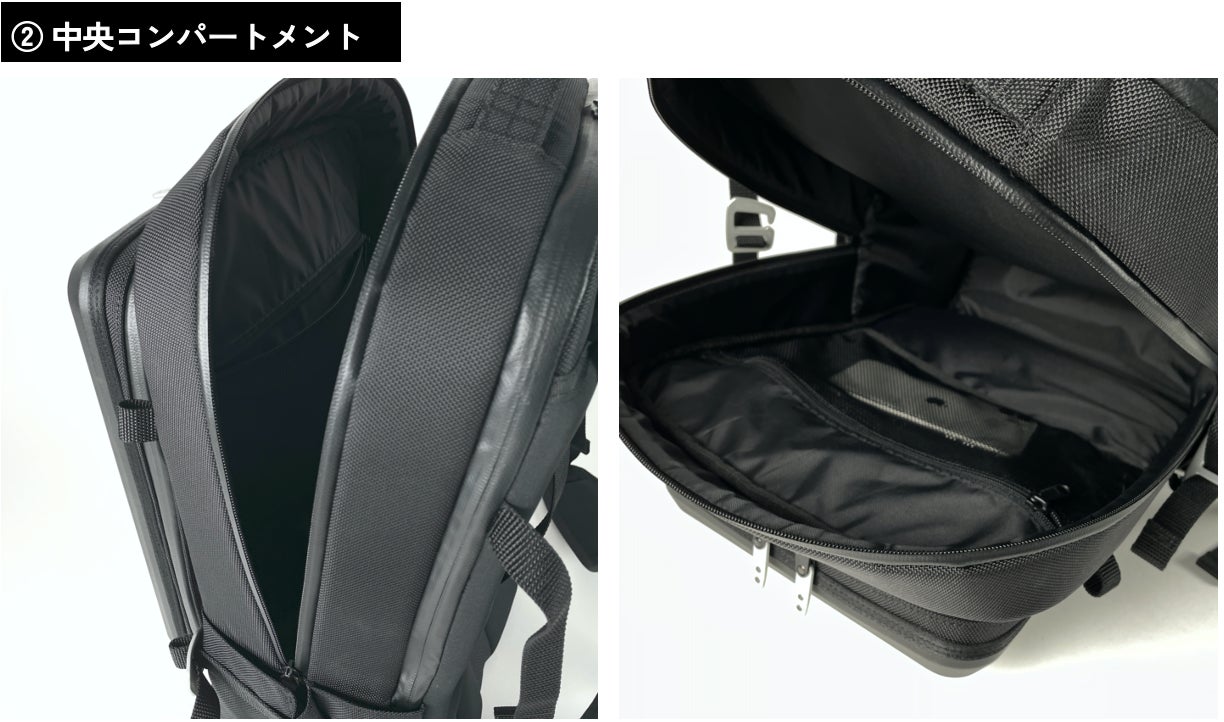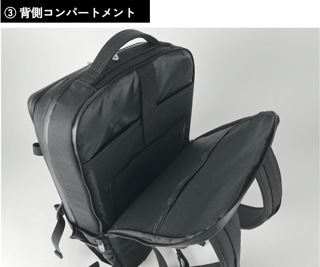 メインポケットは最大15インチまでのラップトップが入るサイズ。ベルクロテープ付きのストラップで留められるほか、タブレット等を入れるのにぴったりな幅22cmの中サイズポケットも搭載しました。背面側には書類などを入れるためのスペース確保。