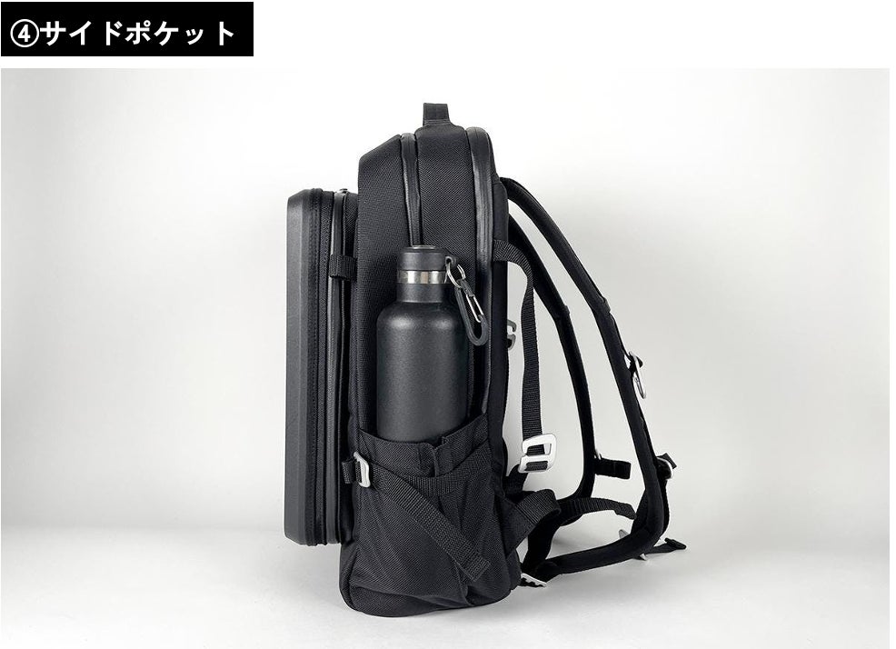 深さ18.5cmの両サイドポケットは見た目以上の収納力があります。ペットボトルや折り畳み傘はもちろん、大きな水筒もすっぽり。※写真で入れているのは1ℓ容量の水筒