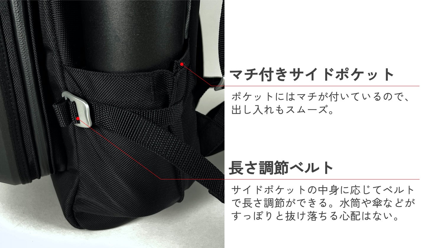 サイドポケットは2.5cmのマチ付き。長さ調節ベルトでしっかりと締め上げられるので、安定感があり中身が抜け落ちる心配はありません。