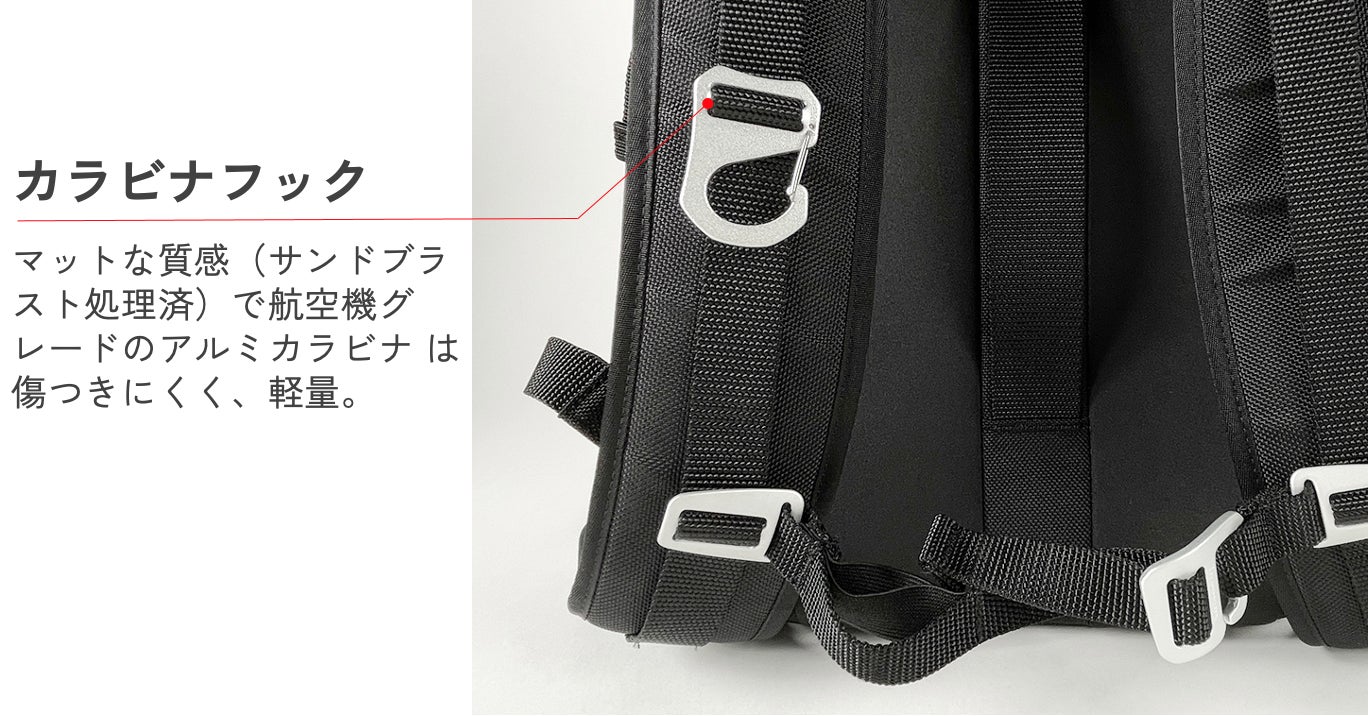 そのほか、ショルダーにはTRIMMERS社のアルミ製カラビナが付属しており、すぐ使うものなどをひっかけておくのに便利。チェストベルトの位置調節部分に、追加でカラビナを通して使うこともできます。