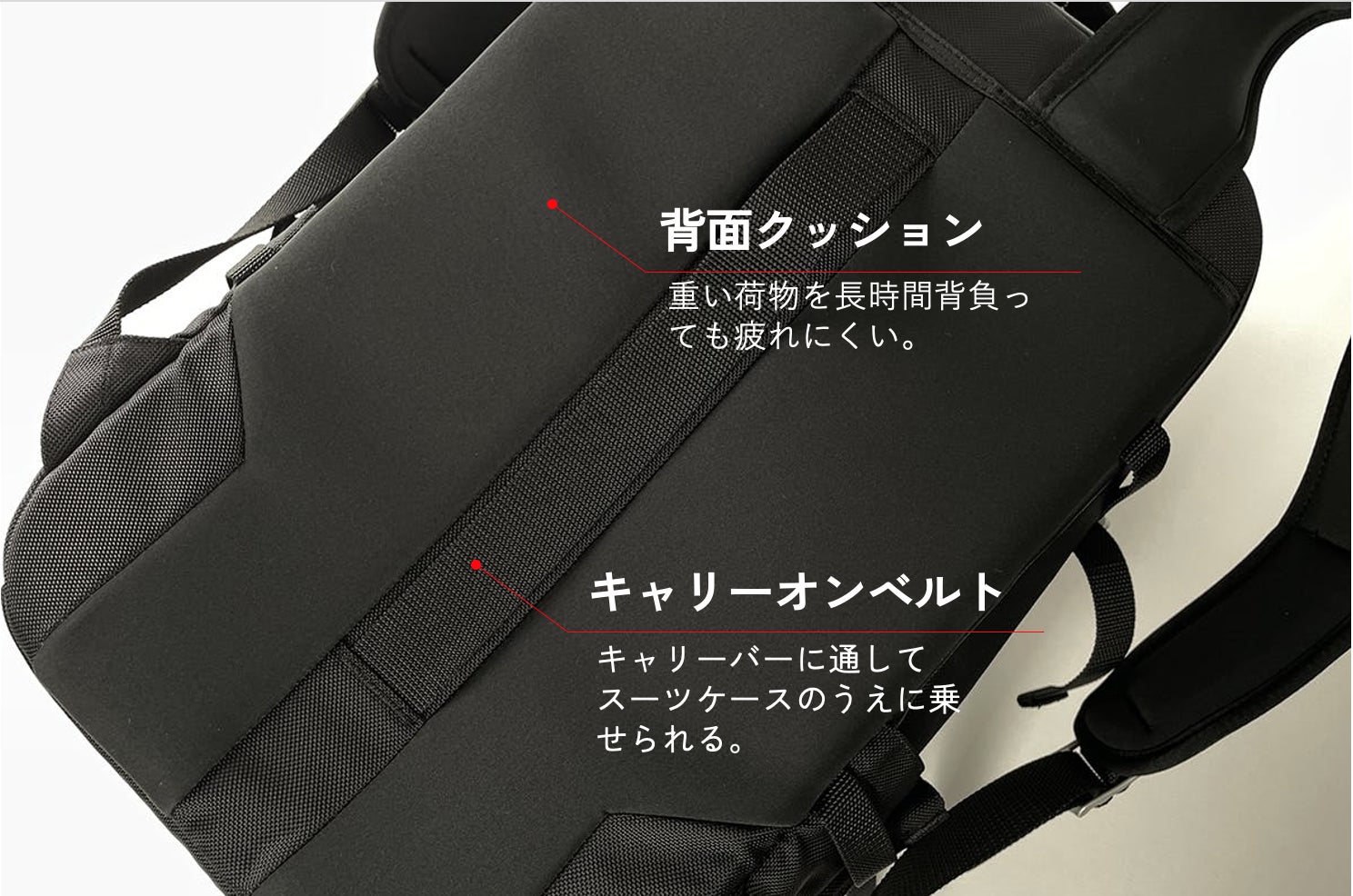 背中部分はクッション素材を施し、重い荷物を長時間背負っても疲れにくい設計となっています。センターにはキャリーオンできるベルト付き。