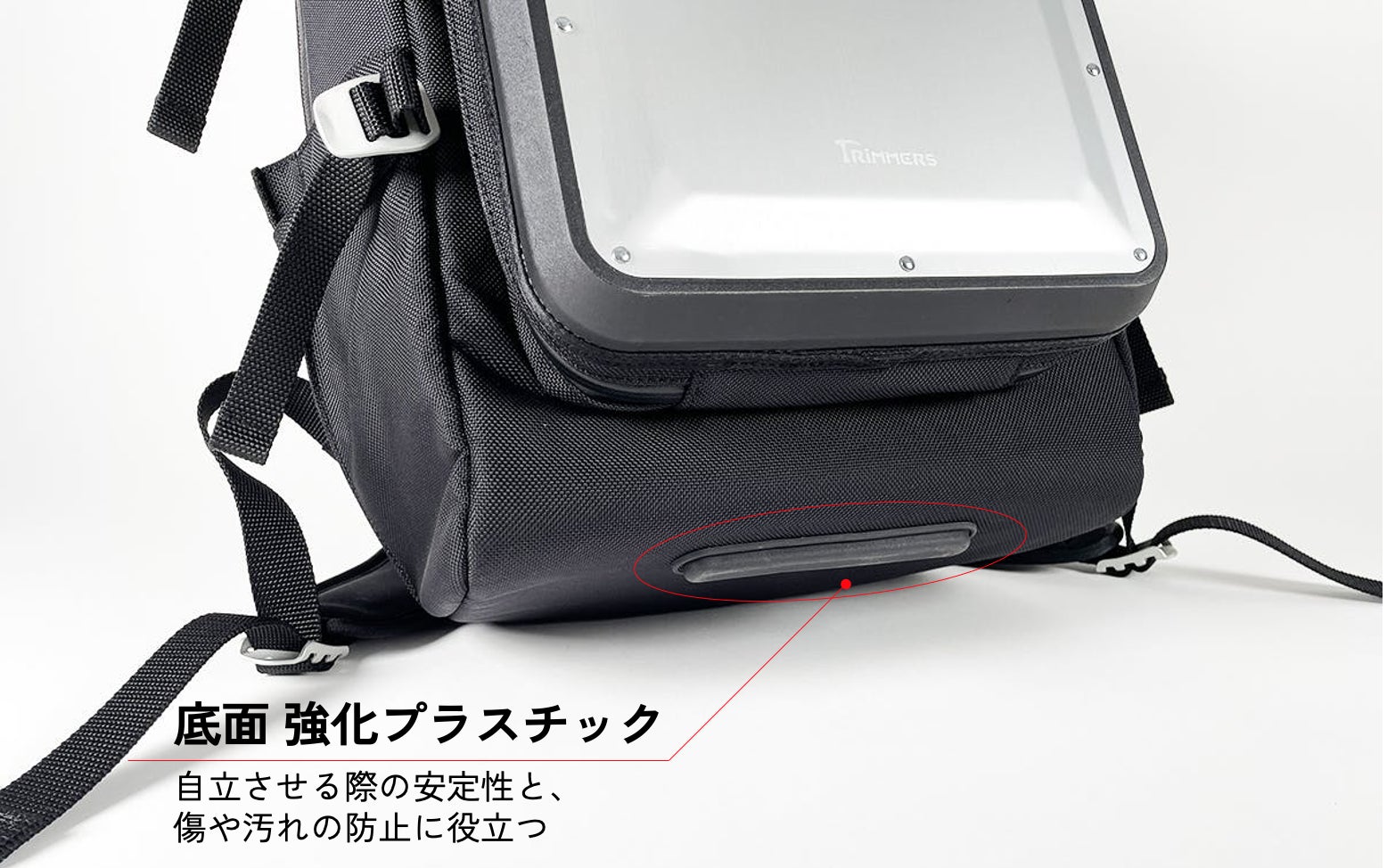底面には自立させる際の安定性と傷や汚れ防止の目的で強化プラスチックを配置しました。