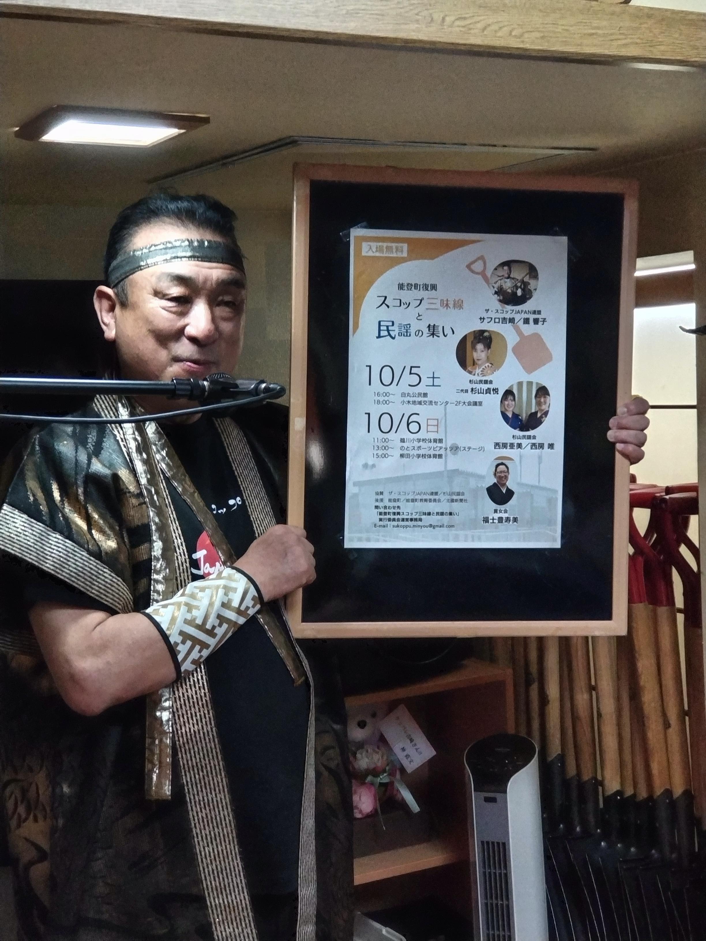 青森で10月の『能登町復興スコップ三味線と民謡の集い』に出演予定のサフロ吉崎さん夫妻にご挨拶をしてきました。公演のポスターをお渡しさせて頂いたところ早速来客されていたお客様にポスターでPRして頂き感謝感激でした。ちょうど青森市内はねぶた祭りの最中で、ねぶたの行列で見かけた「能登半島応援」とか「けっぱれ(頑張れ)、能登!!」と書かれたのぼり旗には流石に胸が熱くなりました。
