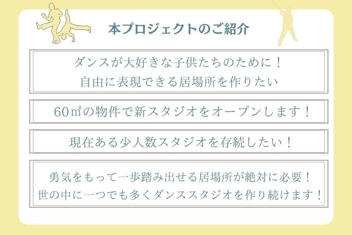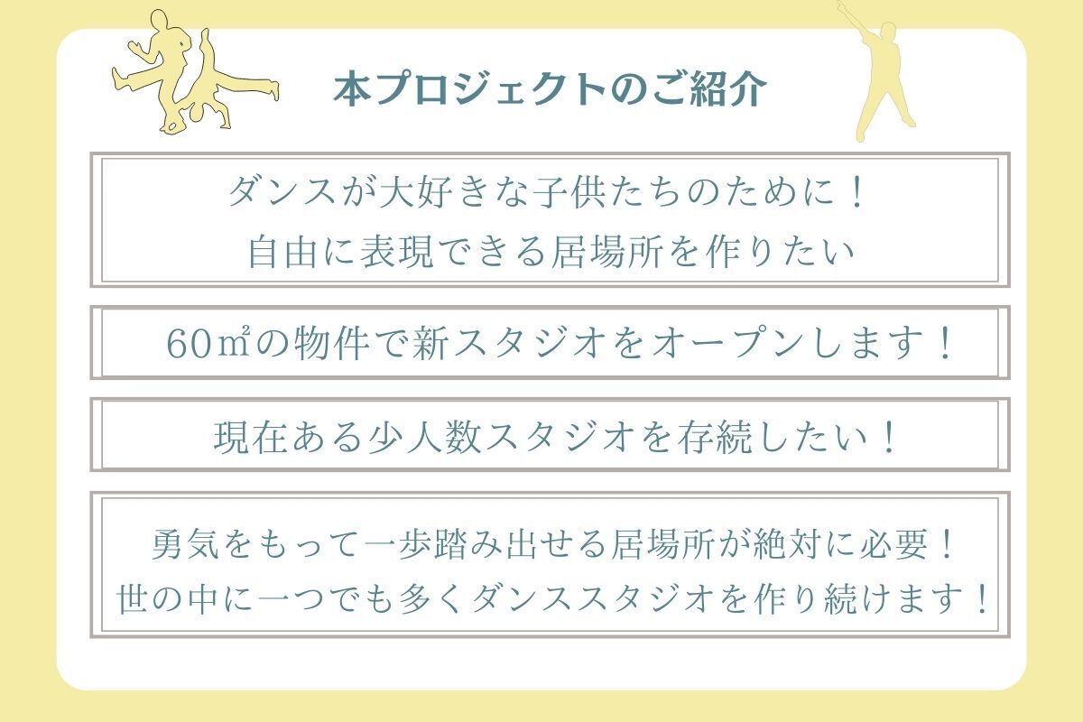 この度東京都杉並区にて、新スタジオをオープンすることになりました。1人でも多くの方々へ “ダンスの楽しさ” と “ 夢を実現することの素晴らしさ”を伝えるために、はじめてクラウドファンディングに挑戦いたします。