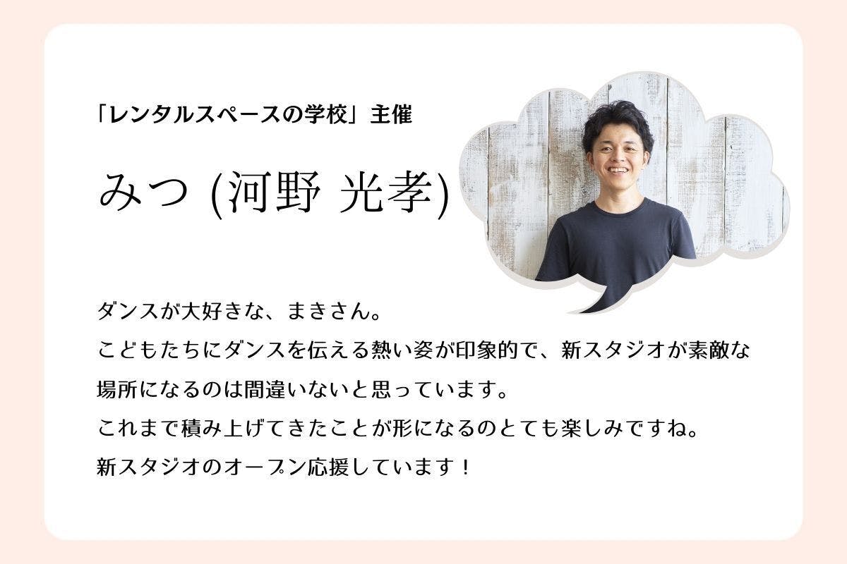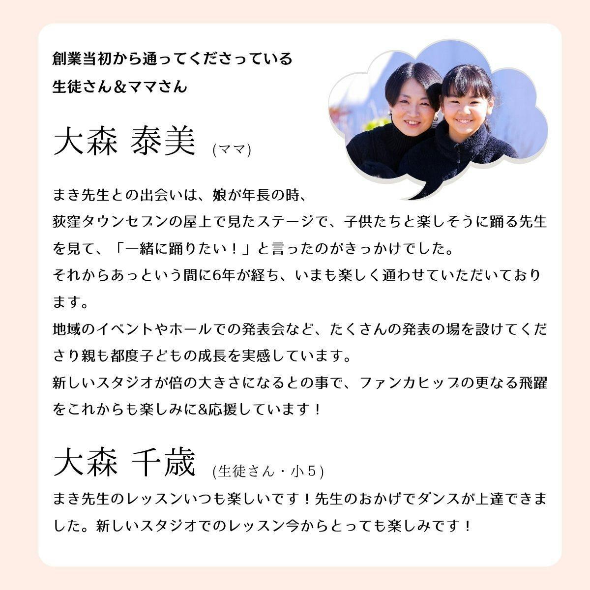 ダンスを踊りたい人が安心して来ることができ、そしてお子様も安心して通うことできる、このスタジオで、繋がりが生まれ、笑顔が連鎖していく、そんな場所にしていきたいです。
