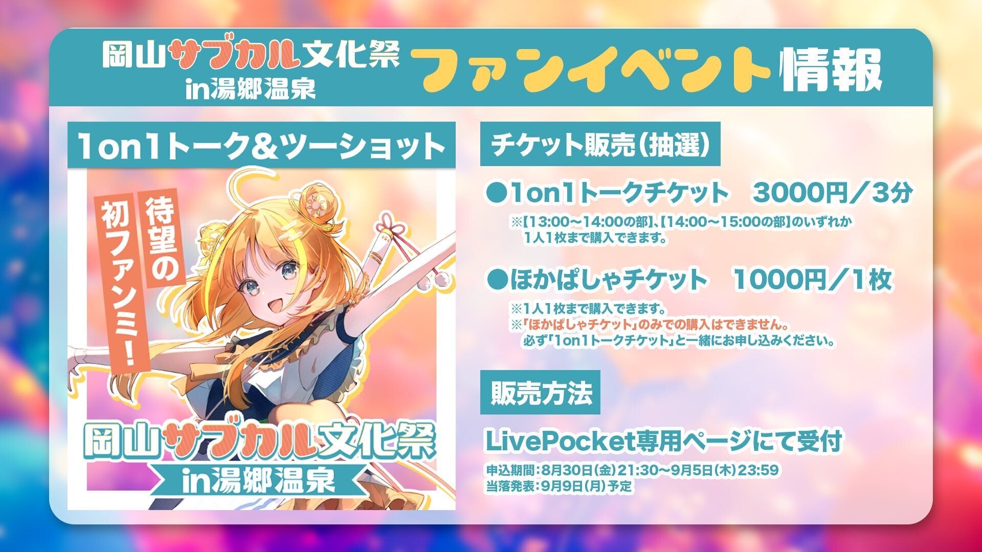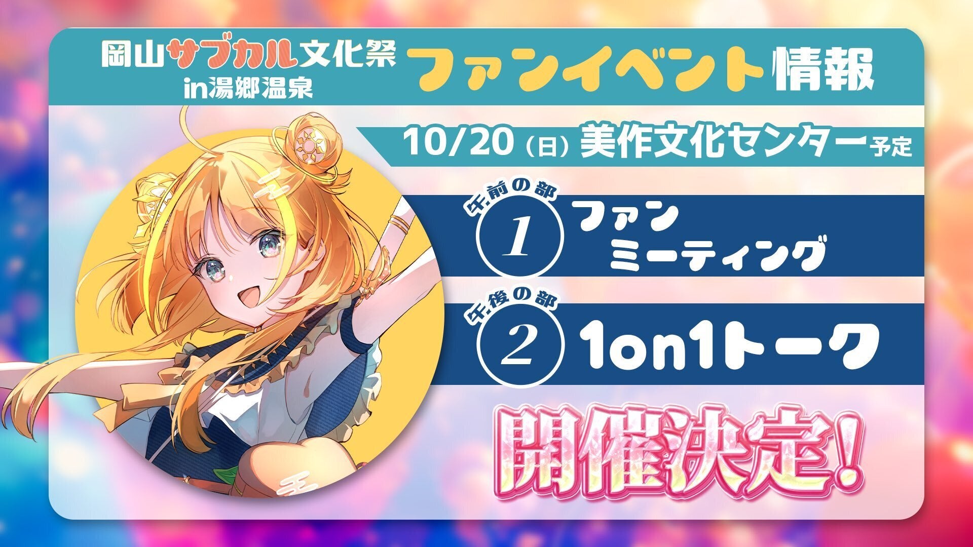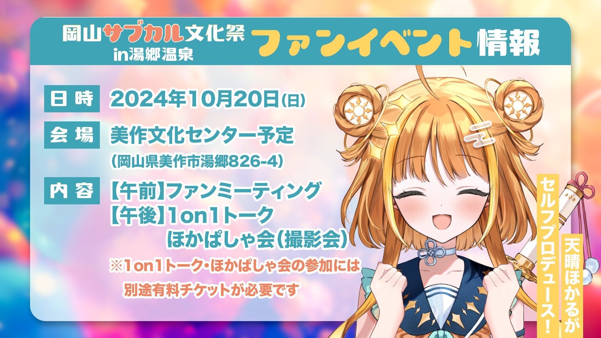 岡山サブカル文化祭in湯郷温泉の2日目にあたる10/20(日)に開催します、OHK岡山放送公認VTuber天晴ほかるさんのファンミーティングの開催概要が決まりました!