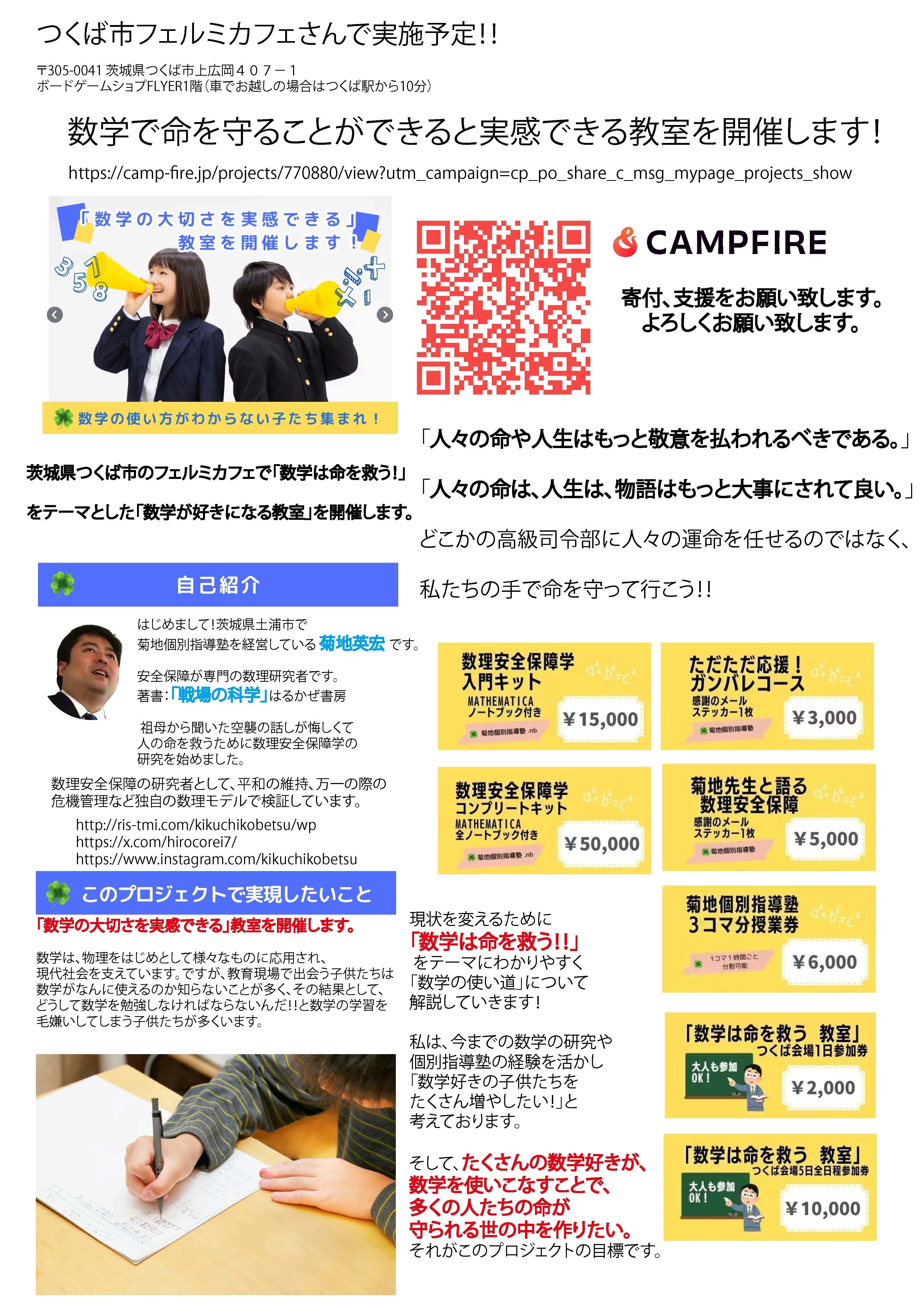 「数学は命を救う教室」の他に、数理安全保障について語るチケットなどリターンを用意しております。「数学の使い道」について子供たちだけではなく、大人でも参加でき、一人でも多くの方に数学に興味を持っていただけるようなリターンを用意しております。