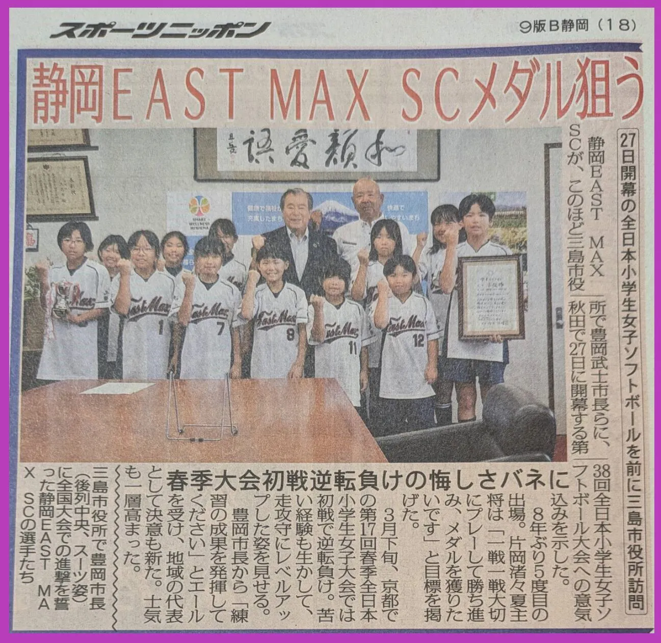 2024/07/25 10:38こんにちは。今日のスポニチにEASTMAXの記事が掲載されました。8年ぶり5度目の夏の全国大会出場。6年生にとっては最後の全国大会です。髪を短くした選手もいて大会への気合が感じられます⭐︎いよいよ、明日は開会式。今朝4:30にマイクロバスで秋田に出発しました!▼出発前の挨拶道のりが長いので今日は1日かけて秋田県まで移動です。朝が早かったのに、とても楽しそうですね。▼SAでの様子全国大会では一戦一戦を大切に全力で勝ちにいきます。引き続き静岡EAST MAXの応援よろしくお願いします!***************先日、21日(日)23:59にクラウドファンディングが終了しました。達成率104%、支援総額417,000円にて成功しました!ご協力いただきました皆さまに心より感謝申し上げます。本当にありがとうございます!!***************▼監督ブログもご覧ください(^^)https://eastmax.hamazo.tv/ もっと見る