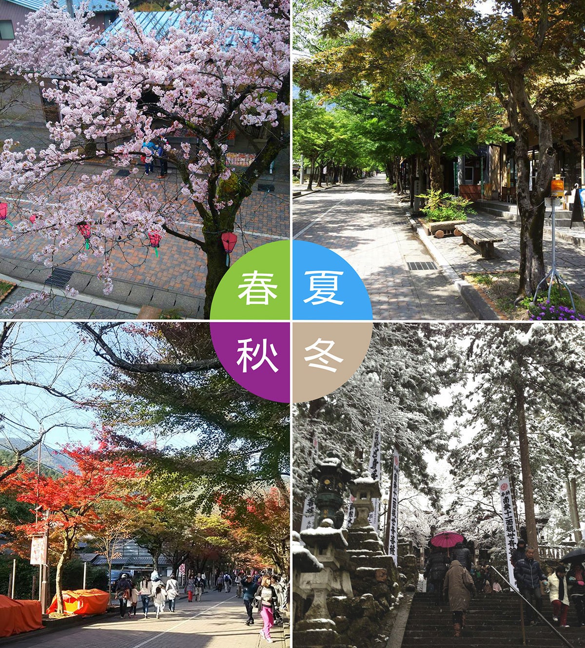 門前までの参道は、なんと1キロにもわたります。春には桜、初夏には新緑、秋には紅葉、冬には雪景色と、四季折々の美しさが楽しめる素晴らしい参道です。日本最古の観音霊場「西国三十三所観音霊場」の第三十三番札所で満願・結願の地らしく厳かな雰囲気が漂う参道には、20件あまりの土産物店や飲食店などが連なっています。「松本屋」は、その中で唯一の料理旅館として皆様をお迎えいたします。