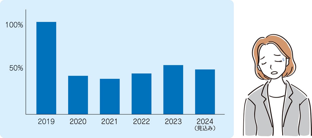 新型コロナ前の売上を100%とすると、コロナ禍では約40%と踏ん張っていたものの、コロナが終息して日常が戻った今でも約56%と低迷しています。確かに需要は増えていますが、施設の老朽化でその需要に応えられない現状があります。