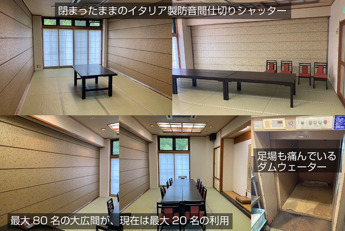 80名入れる大広間にある間仕切りのシャッターが壊れてシャッターが閉じっぱなしになっています。そのため、大広間は3つの部屋に仕切られたままで、最大20名の宴会しか受けることができません。この間仕切りシャッターはイタリア製の防音仕様の特別なもので、いくつもの業者の方を呼んで見ていただきましたが、古くて部品がないので、部品を作るところからになり、修理には500万円余りがかかるということでした。
