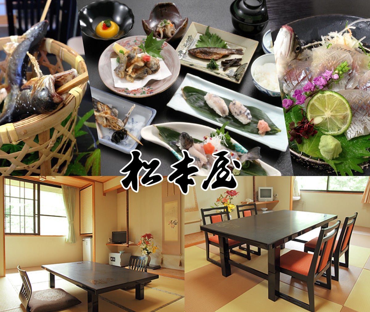 純和風の客室10部屋を構え、約50名のお客様をお迎えすることができます。最大80名様を収容する宴会場は、その昔から各種宴会をはじめ仏事の御会食などでご利用いただいております。昼食のご提供は200名様まで、団体の参拝者の方々の受け入れも可能です。送迎バスも完備しています。店先にある食事処でのランチ利用も可能です。麺類から本格的な鮎のコース料理まで取り揃えております。